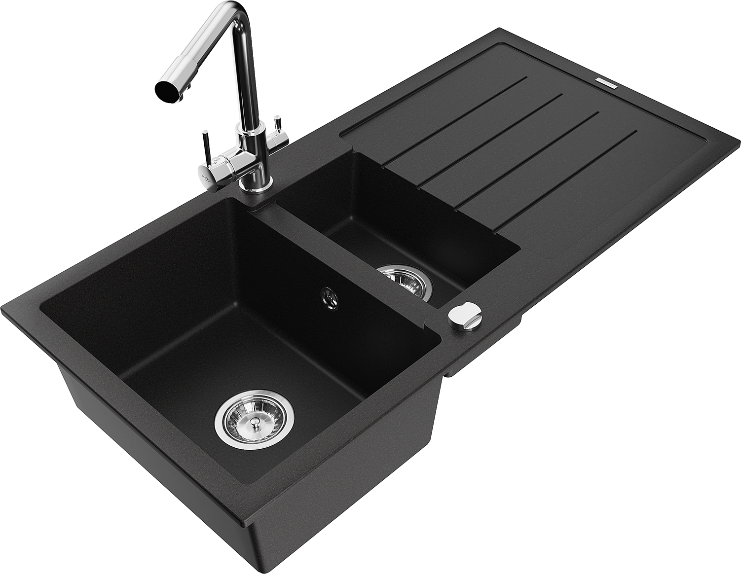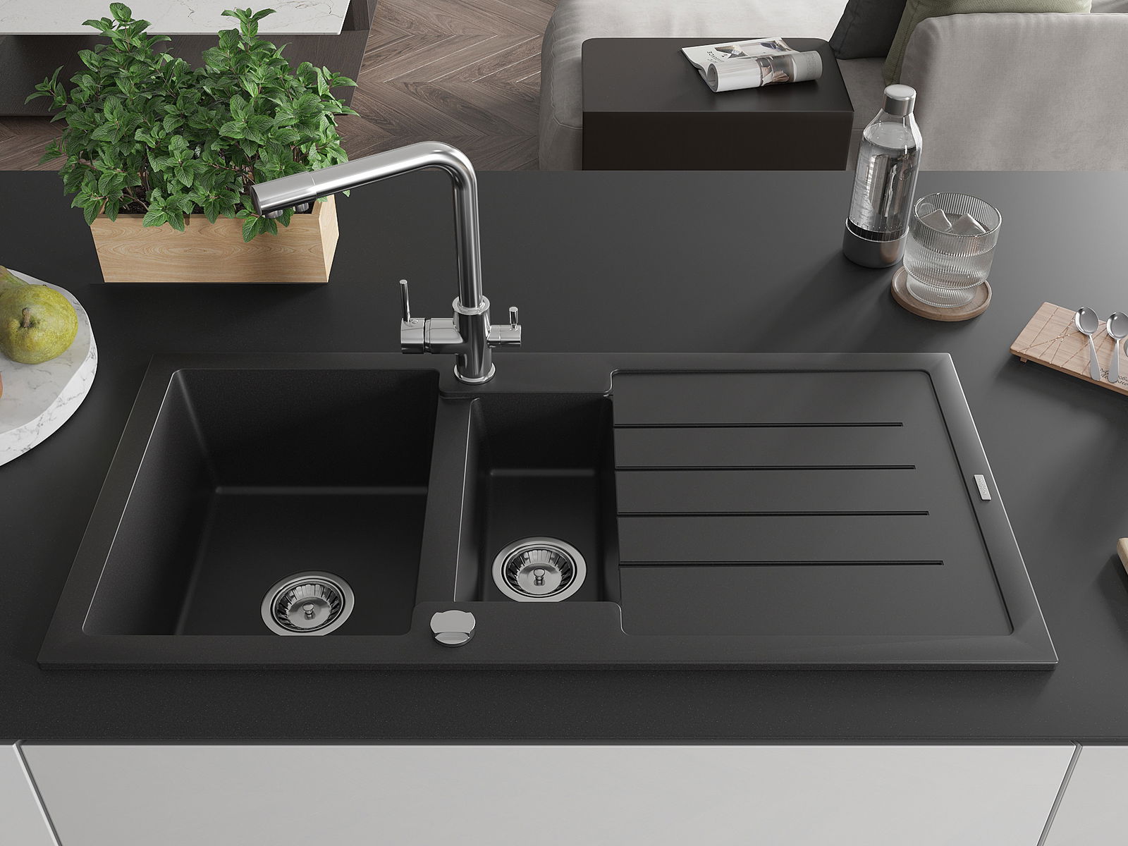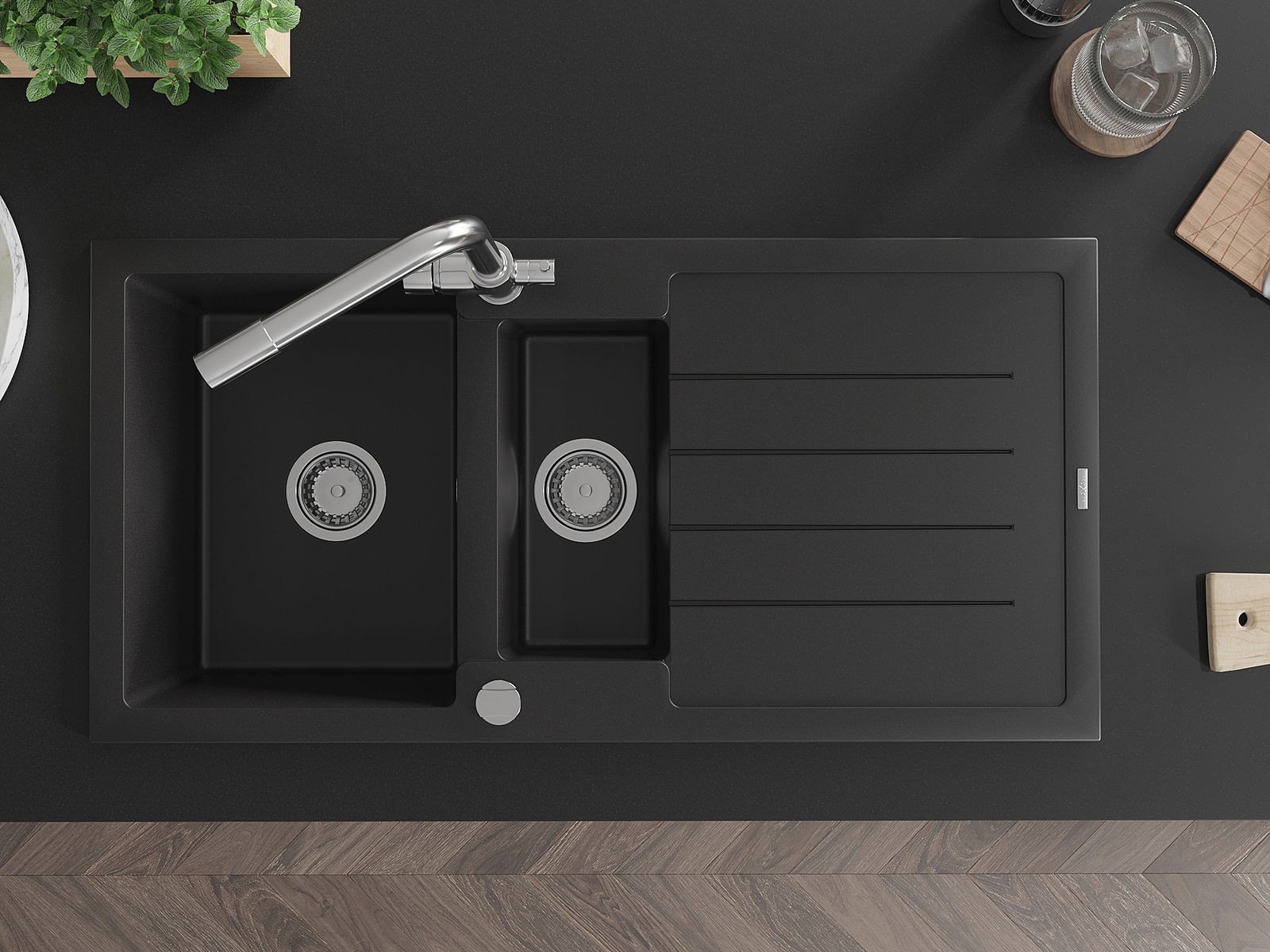 Mexen Andres 1,5-medencés gránit mosogató csepegtetővel és Duero konyhai csapteleppel, fekete - 6515-77-671600-00