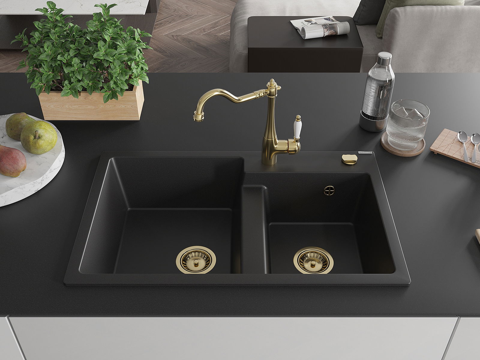 Mexen Tomas gránit 2-medencés mosogató Carla konyhai csapteleppel, fekete - 6516-77-670700-50