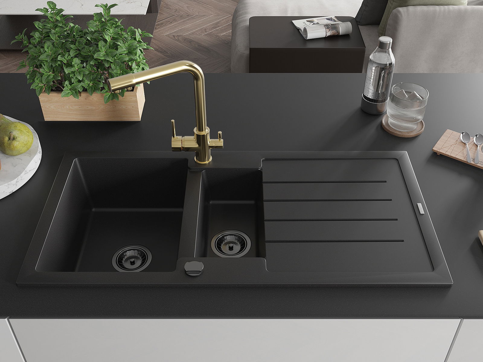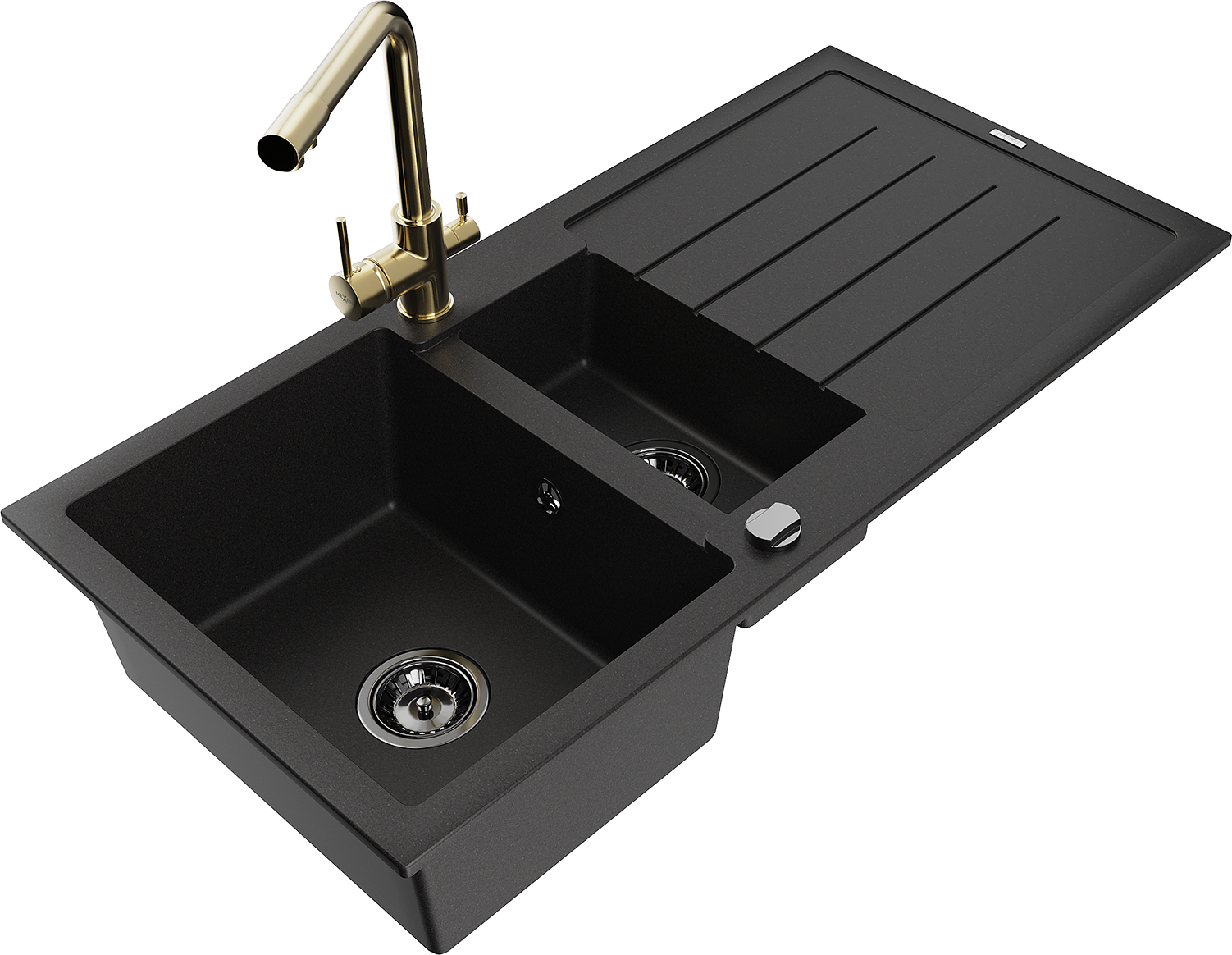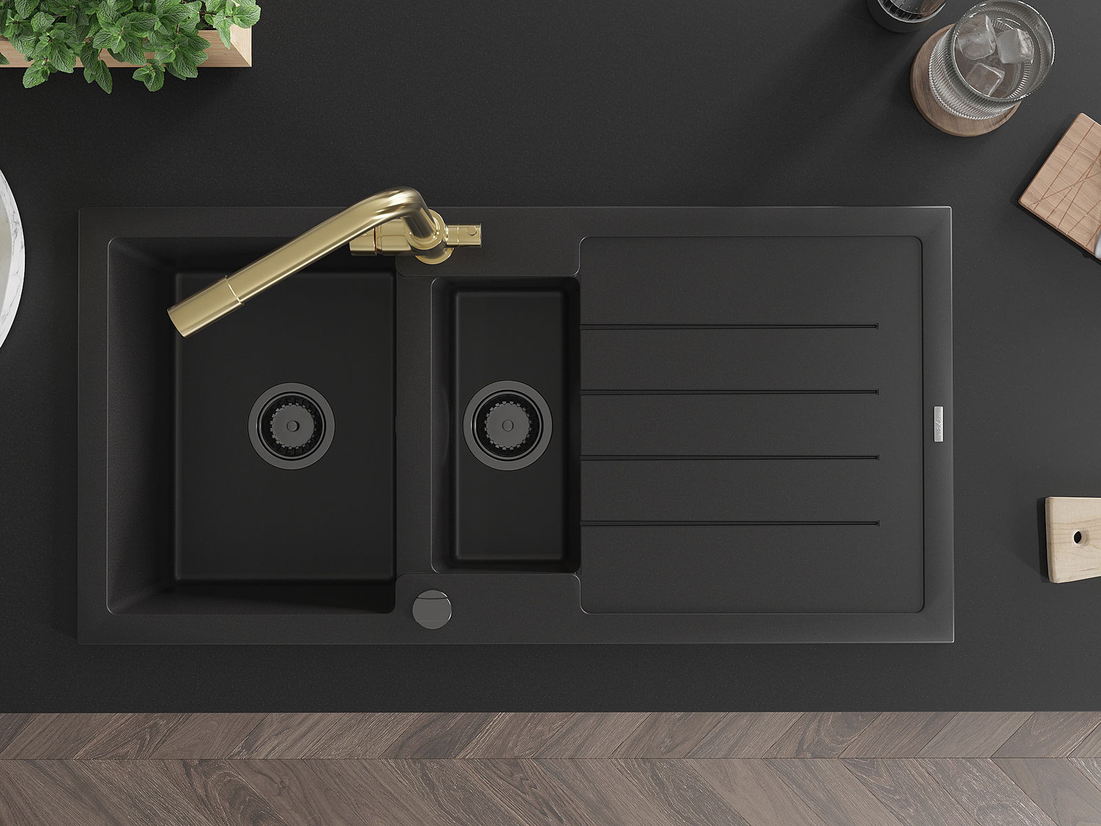 Mexen Andres 1,5 rekeszes gránit mosogató csepptálcával és Duero konyhai csapteleppel, fekete - 6515-77-671600-50-B