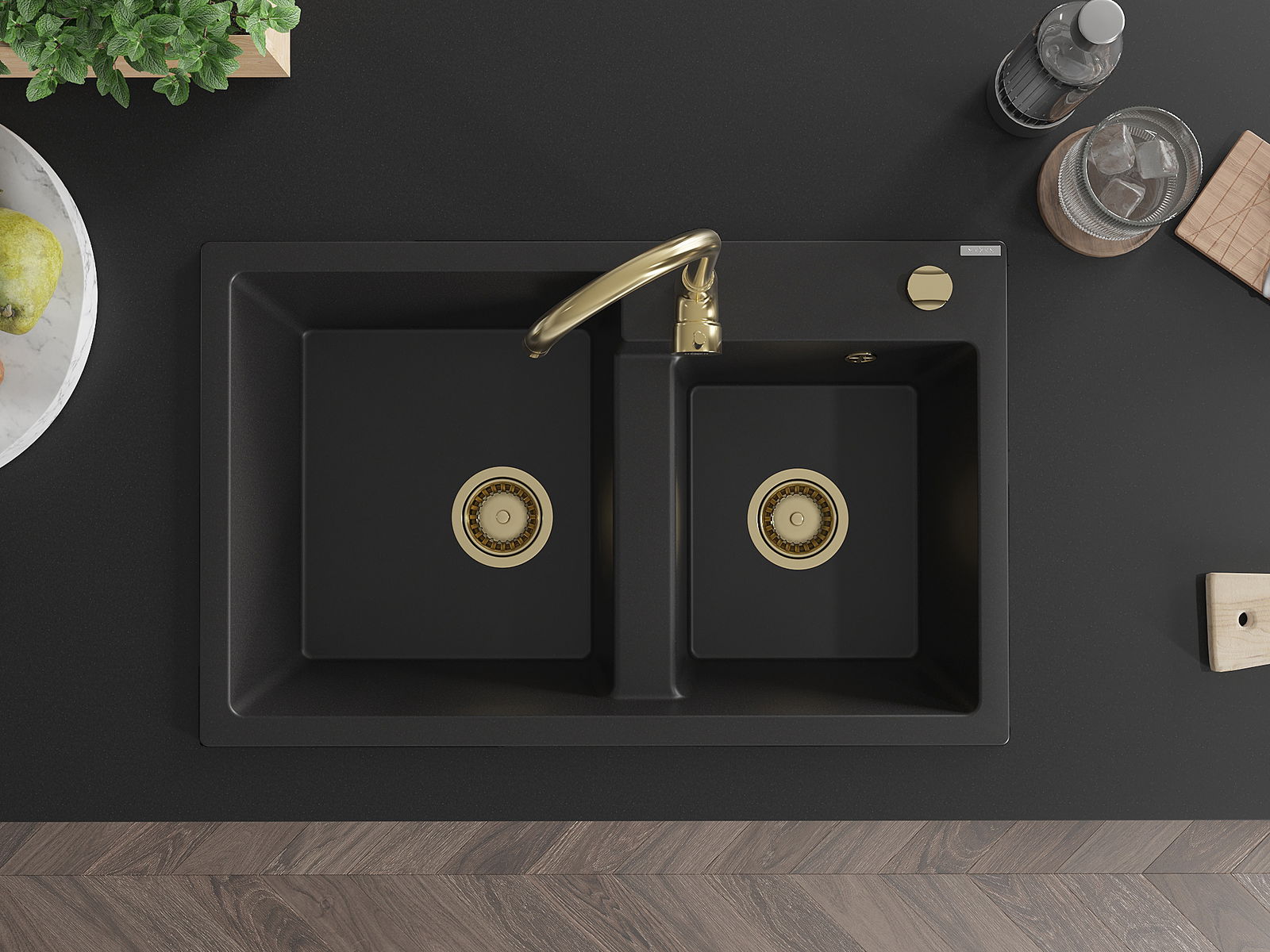 Mexen Tomas 2 kamrás gránit mosogató Telma konyhai csapteleppel, fekete - 6516-77-670200-50