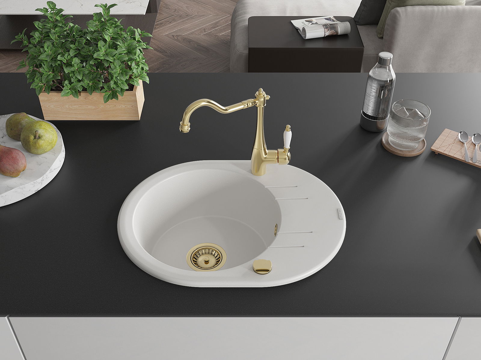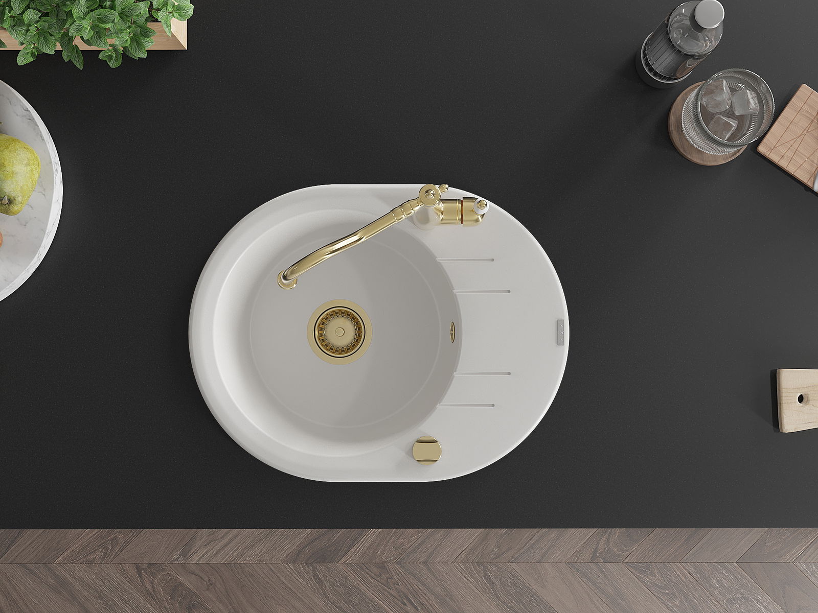 A mosogató kiváló minőségű gránitból készül. Ez egy elegáns és mindenekelőtt minden konyhához praktikus kiegészítés, stílusától függetlenül. A kiváló minőségű és a gránit tartósság biztosítja a sok éves használatát.