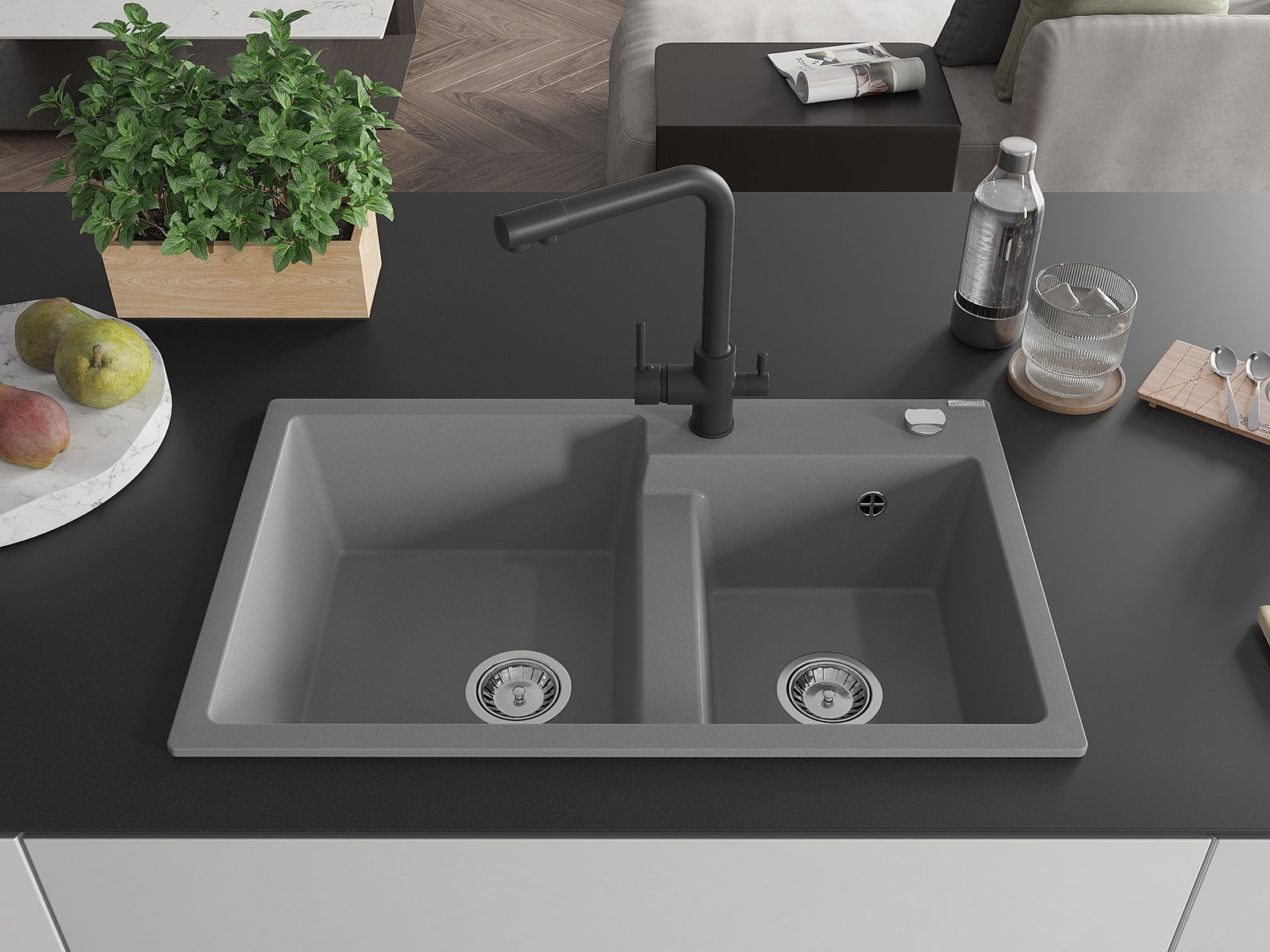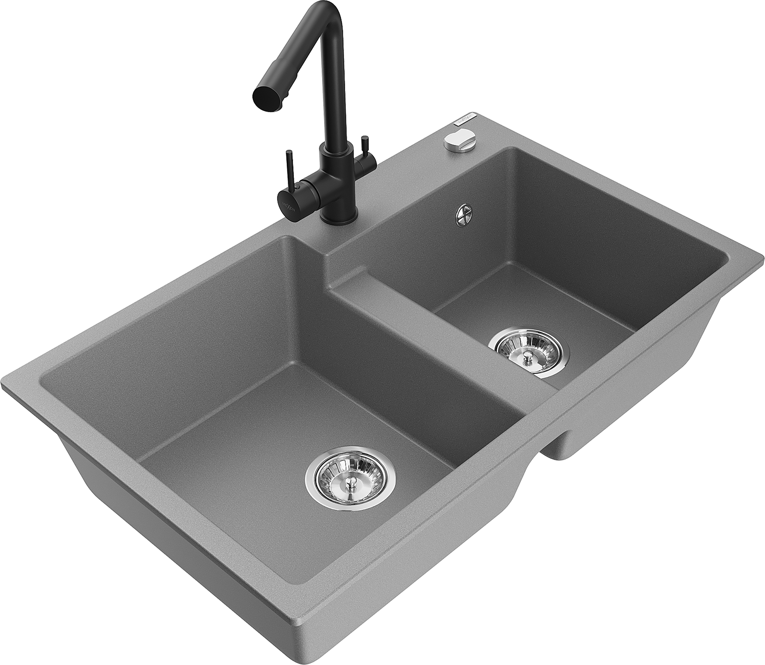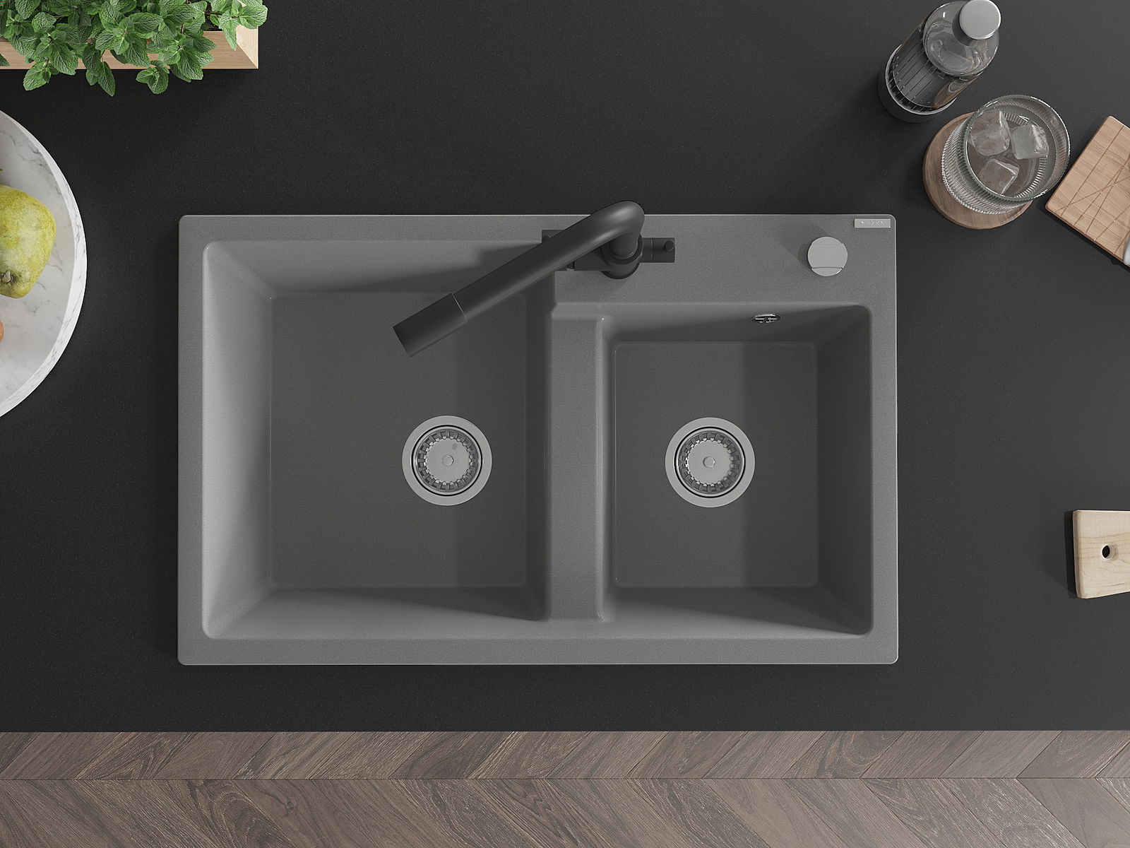 Mexen Tomas kétkamrás gránit mosogató Duero konyhai csapteleppel, szürke - 6516-71-671600-70