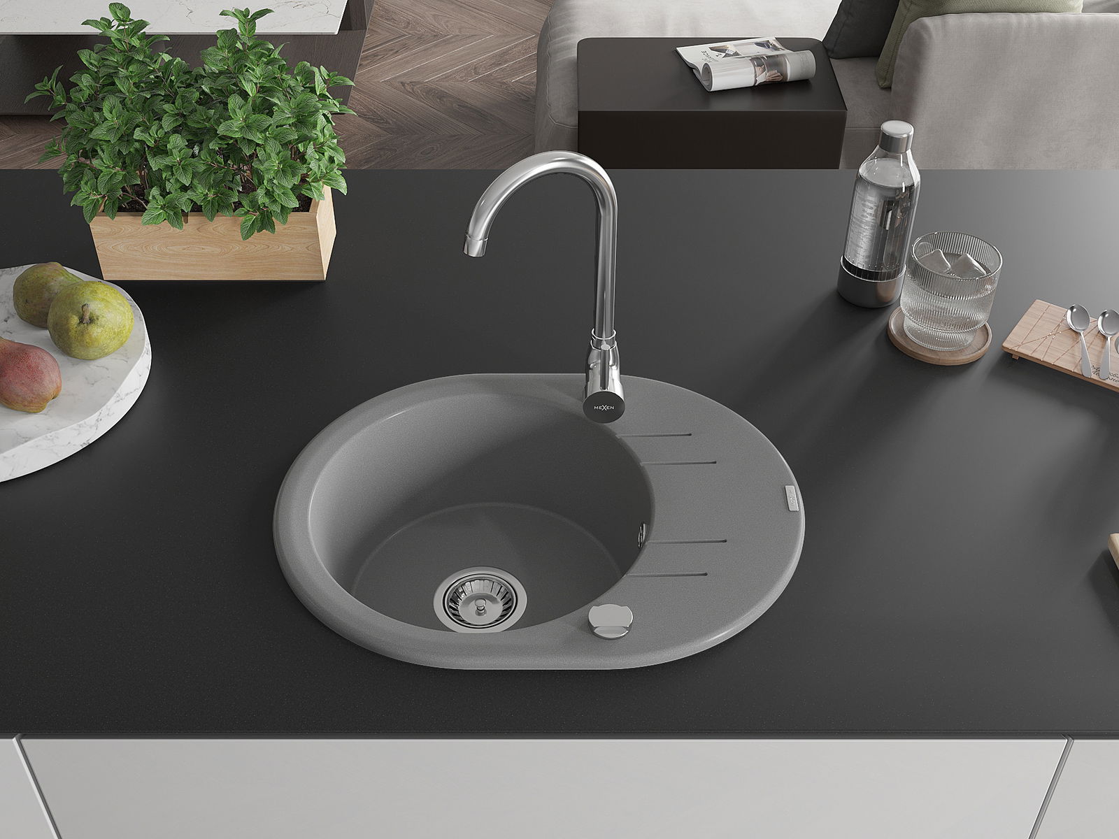 Mexen Kevin 1-medencés gránit mosogató csepegtetővel és Telma konyhai csapteleppel, szürke - 6517-71-670200-00