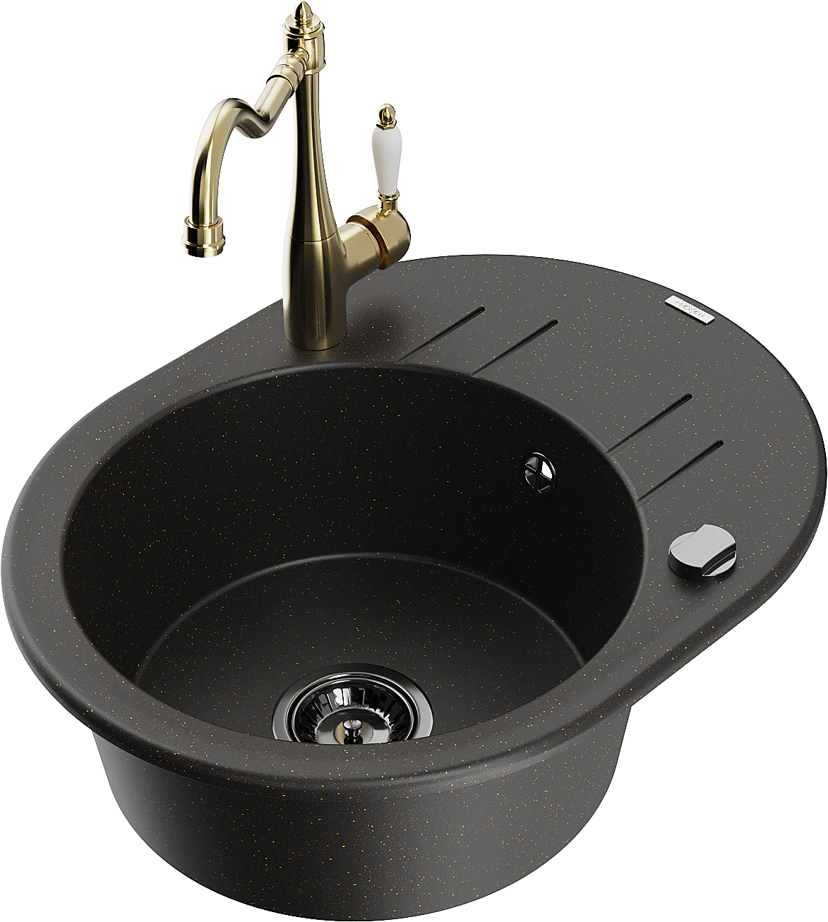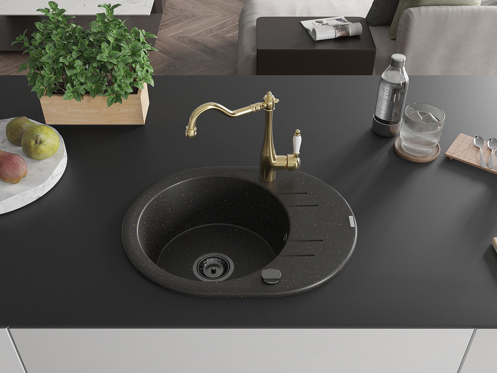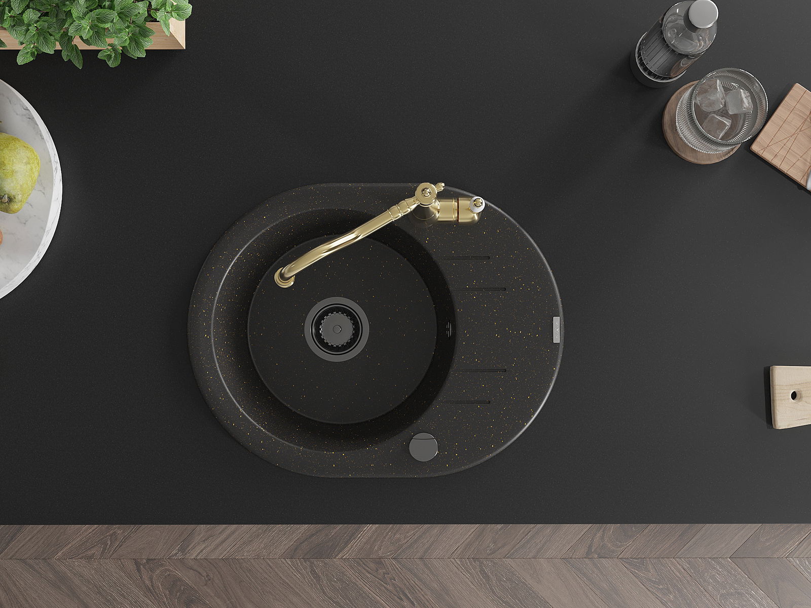 Mexen Kevin 1-medencés gránit mosogató csepegtetővel és Carla konyhai csapteleppel, fekete/arany metál - 6517-75-670700-50-B