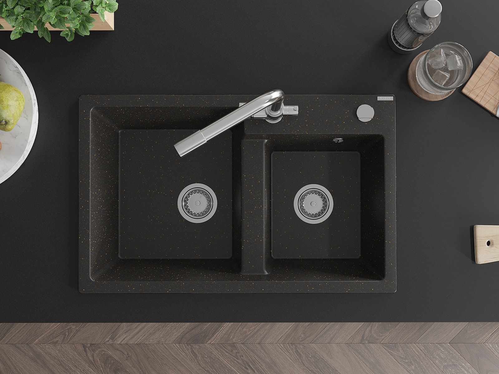 Mexen Tomas gránit mosogatótálca 2-kamrás konyhai csappal Duero, fekete/arany metál - 6516-75-671600-00
