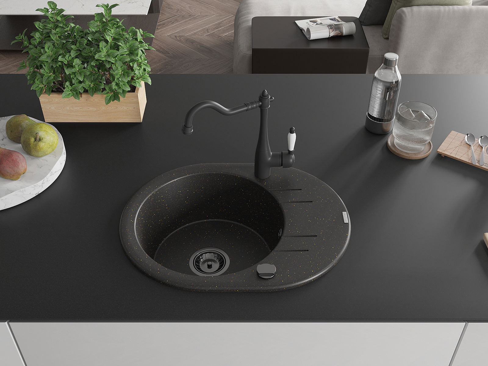 A mosogató kiváló minőségű gránitból készül. Ez egy elegáns és mindenekelőtt minden konyhához praktikus kiegészítés, stílusától függetlenül. A kiváló minőségű és a gránit tartósság biztosítja a sok éves használatát.