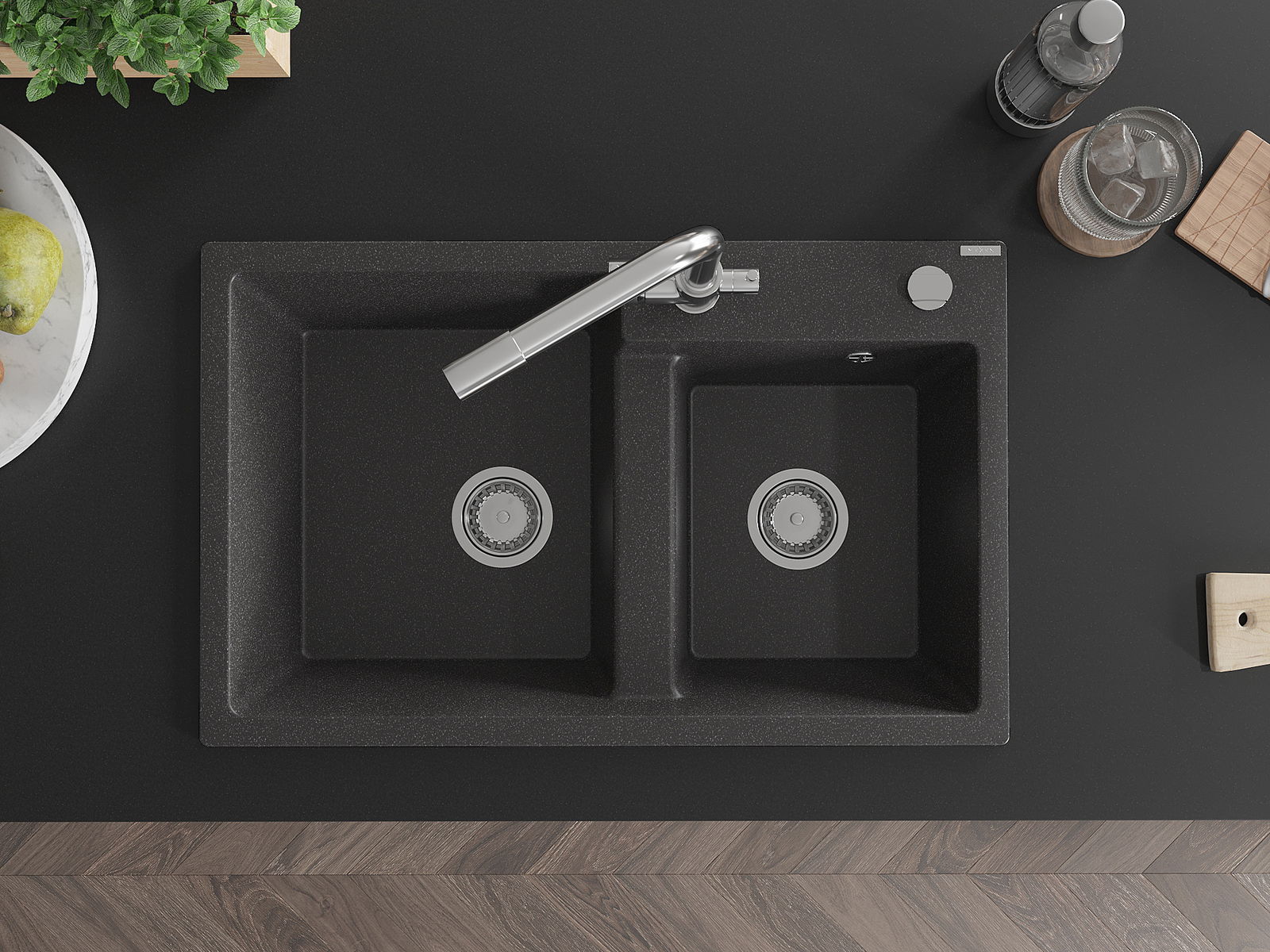 Mexen Tomas gránit mosogató 2-medencés konyhai csapteleppel Duero, fekete pöttyös - 6516-76-671600-00