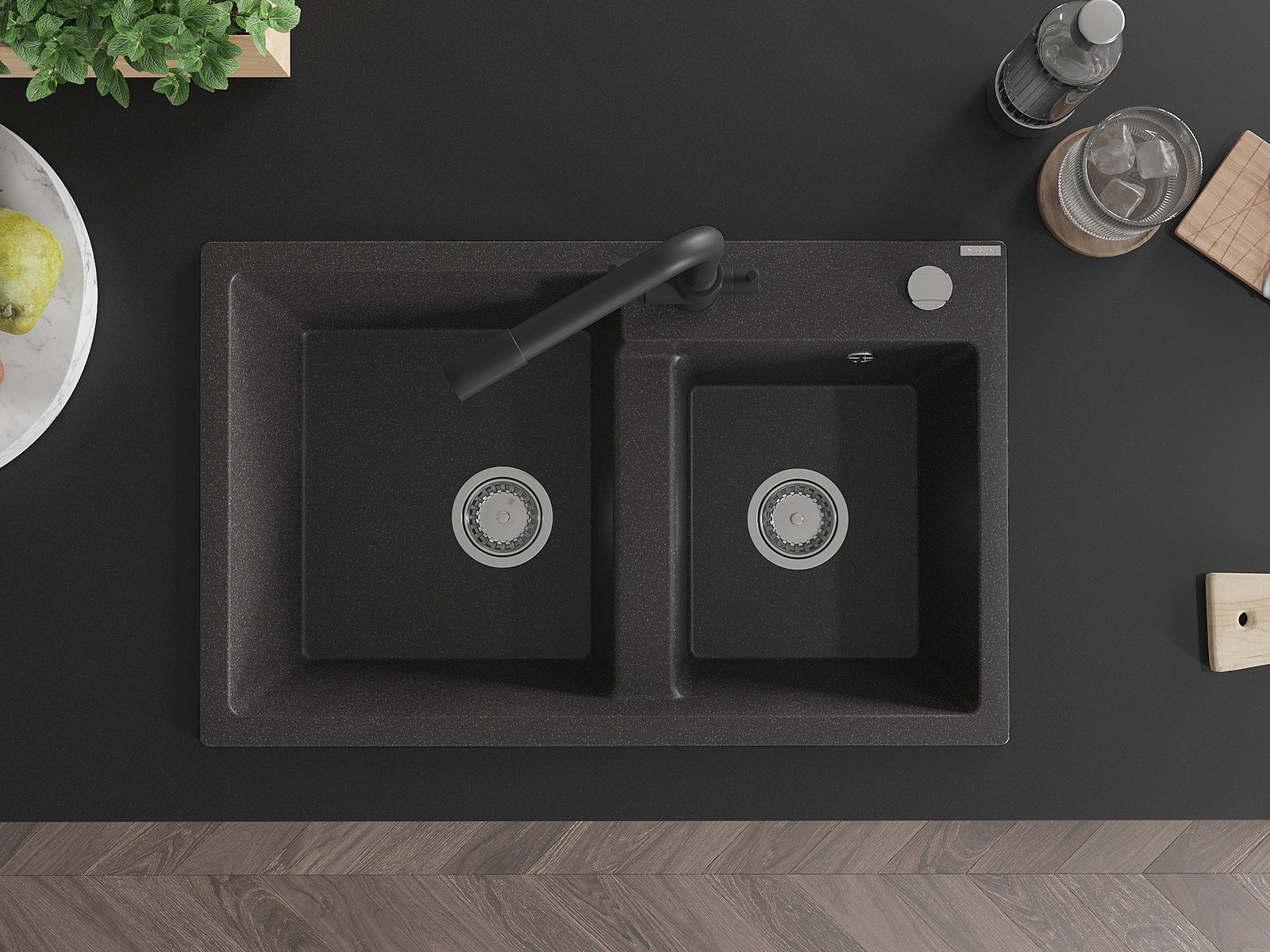 Mexen Tomas gránit kéttálcás mosogató Duero konyhai csapteleppel, fekete pöttyös - 6516-76-671600-70