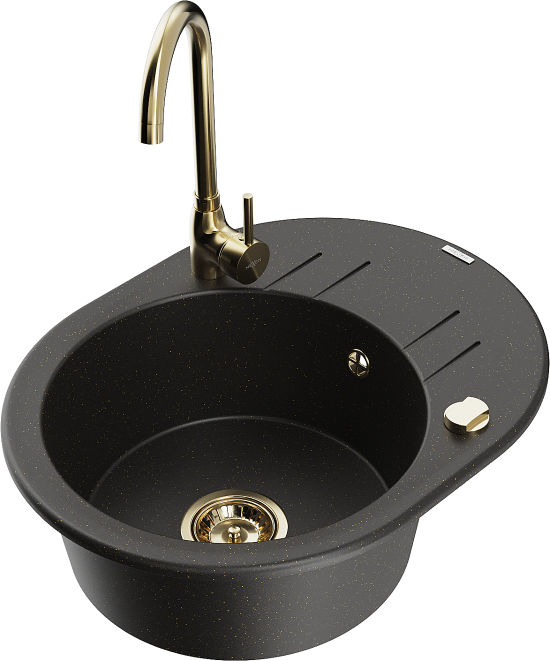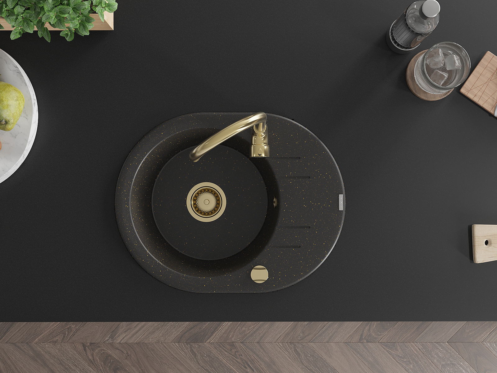 Mexen Kevin gránit egymedencés mosogató csepptálcával és konyhai csappal, Telma, fekete/arany metál - 6517-75-670200-50
