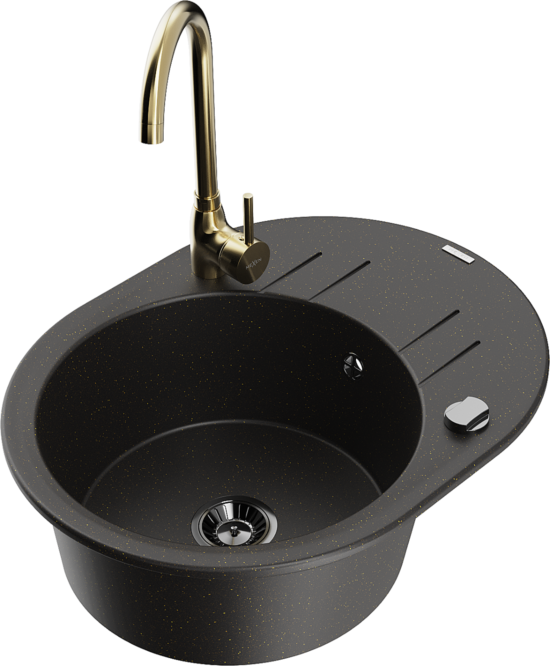 Mexen Kevin gránit mosogató 1-medencés csepptálcával és Telma konyhai csapteleppel, fekete/arany metál - 6517-75-670200-50-B