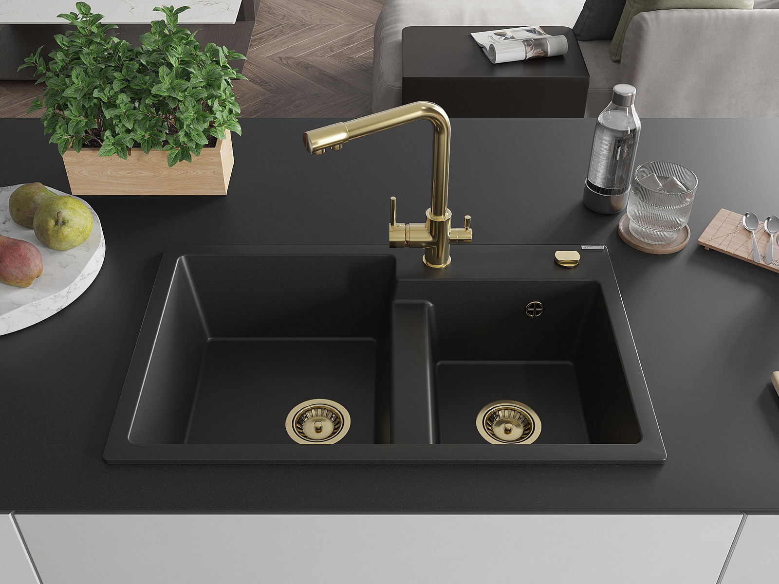 Mexen Tomas gránit 2-medencés mosogatótálca Duero konyhai csappal, fekete - 6516-77-671600-50
