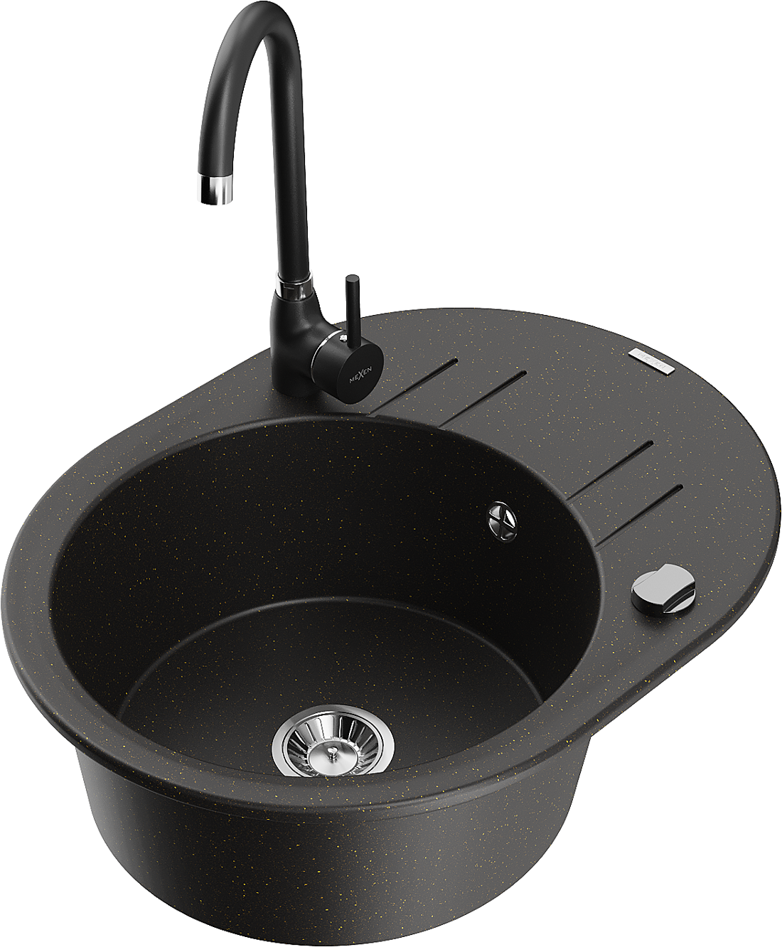 Mexen Kevin gránit mosogató, 1-medencés, csepegtetővel és Telma konyhai csapteleppel, fekete/arany metál - 6517-75-670200-70