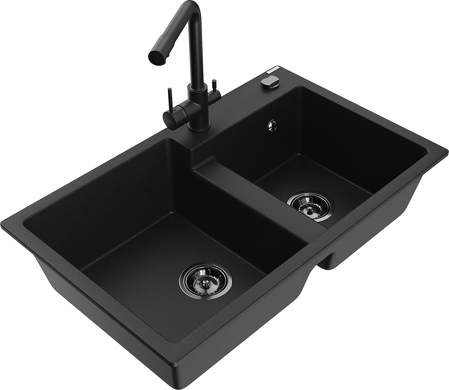 Mexen Tomas 2-kamrás gránit mosogató Duero konyhai csappal, fekete - 6516-77-671600-70-B