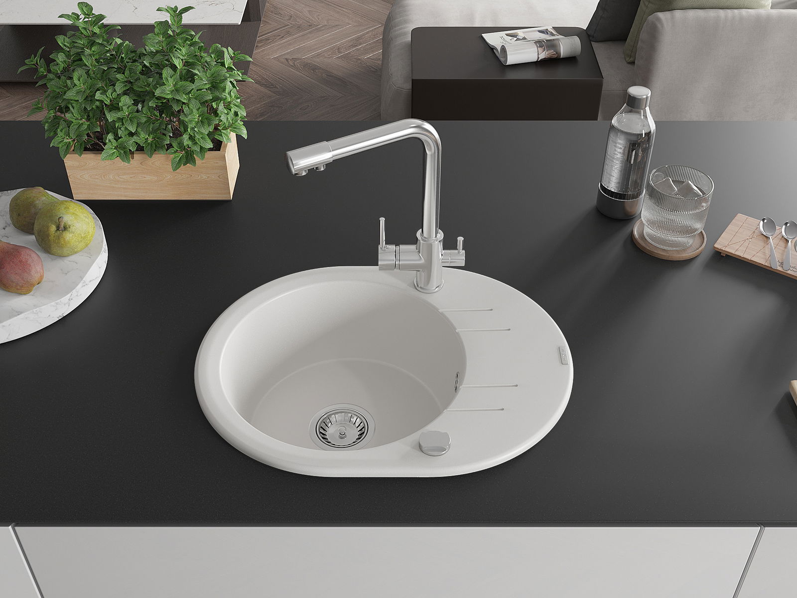 A mosogató kiváló minőségű gránitból készül. Ez egy elegáns és mindenekelőtt minden konyhához praktikus kiegészítés, stílusától függetlenül. A kiváló minőségű és a gránit tartósság biztosítja a sok éves használatát.