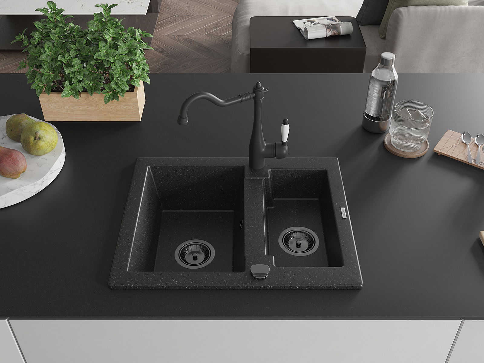 Mexen Carlos gránit mosogató 1,5 medencés Carla konyhai csapteleppel, fekete/ezüst metál - 6518-73-670700-70-B