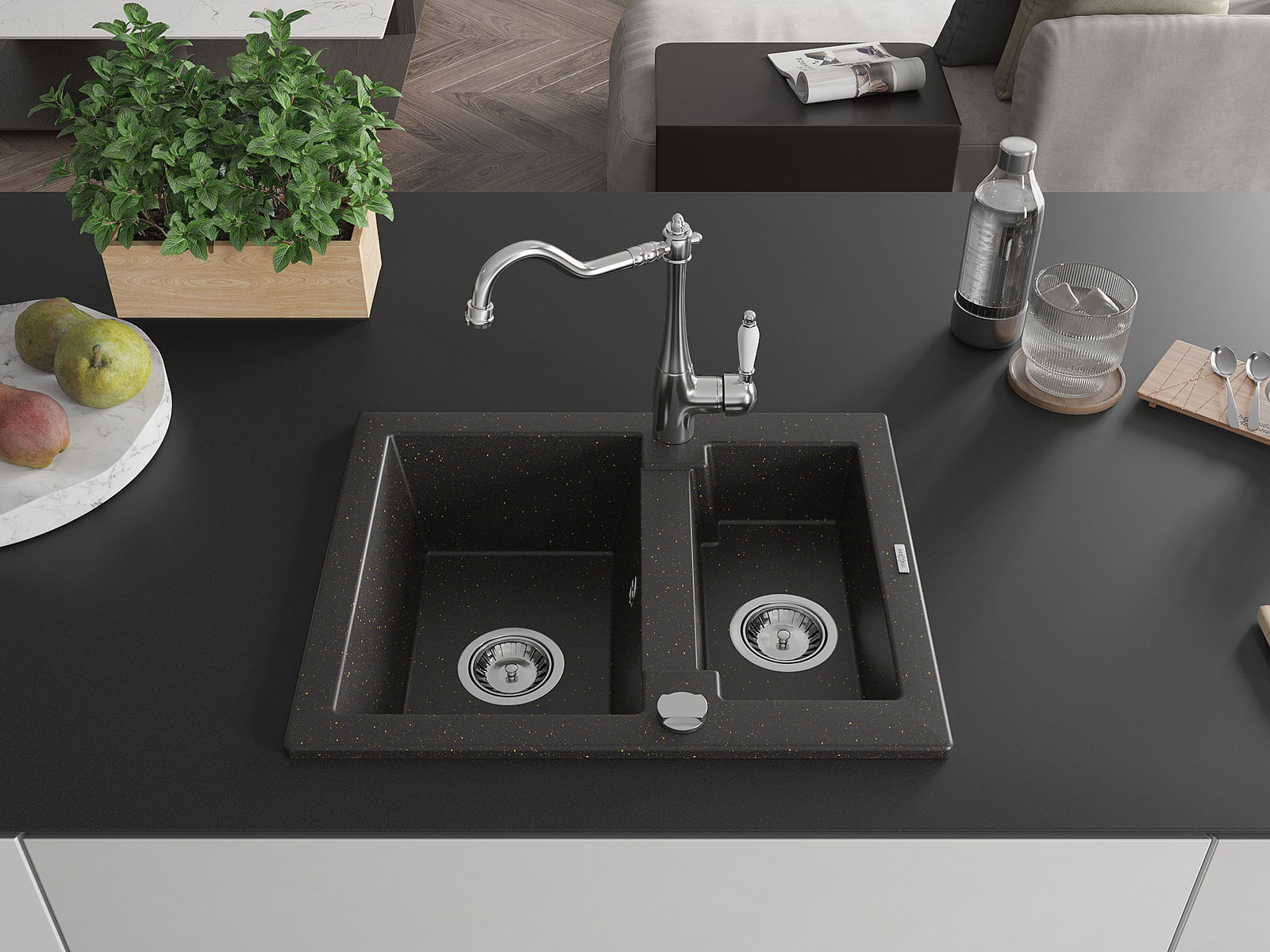 Mexen Carlos 1,5-medencés gránit mosogató Carla konyhai csappal, fekete/arany metál - 6518-75-670700-00