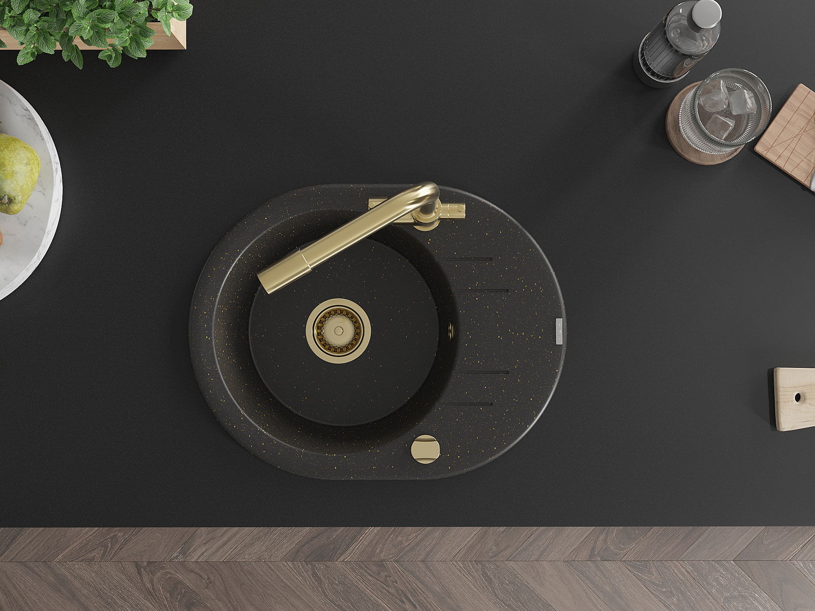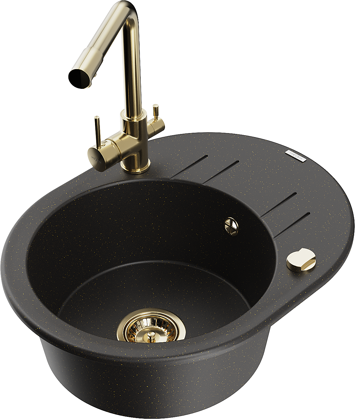 Mexen Kevin 1-medencés gránit mosogató csepegtetővel és Duero konyhai csappal, fekete/arany metál - 6517-75-671600-50