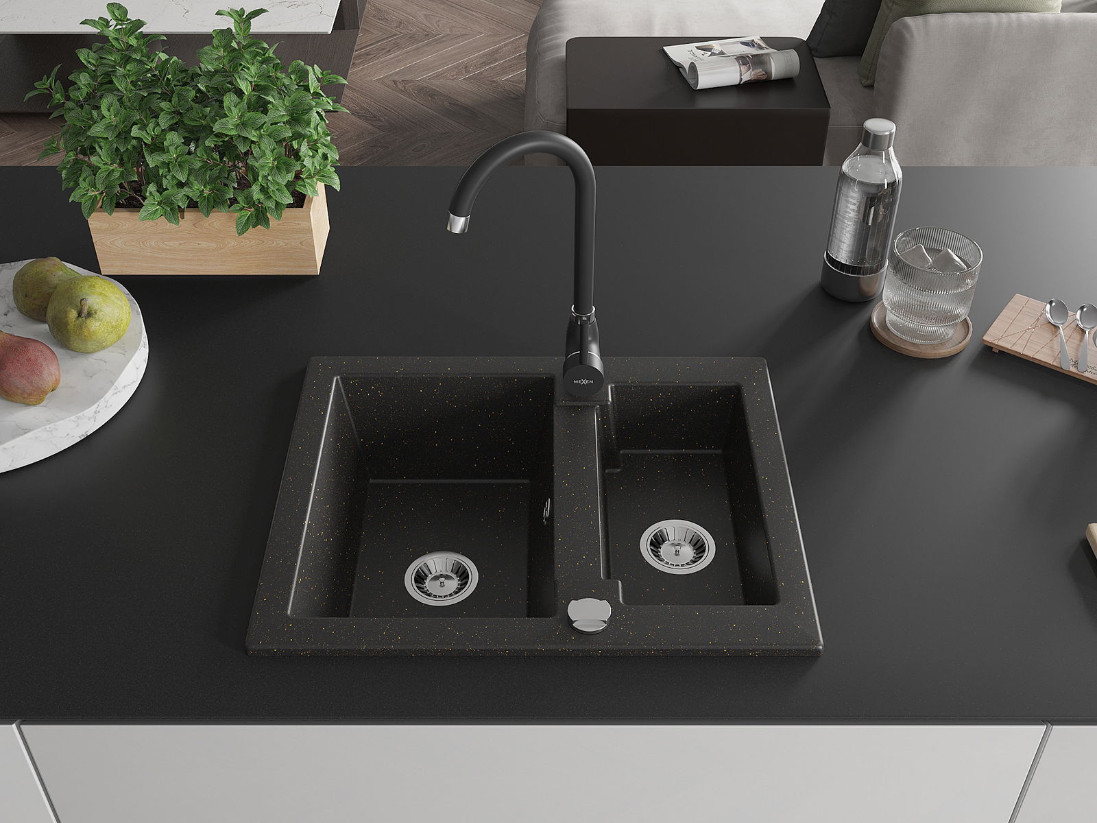 Mexen Carlos gránit 1,5-medencés mosogató Telma konyhai csapteleppel, fekete/arany metál - 6518-75-670200-70