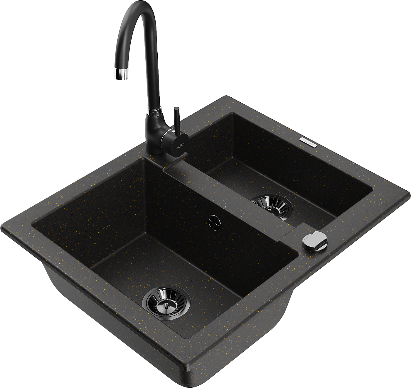 Mexen Carlos 1,5 rekeszes gránit mosogató Telma konyhai csapteleppel, fekete/arany metál - 6518-75-670200-70-B