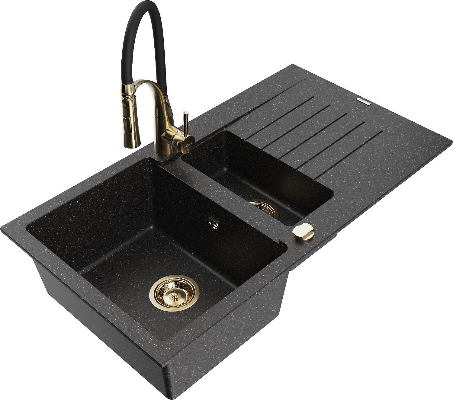 Mexen Matias gránit mosogató 1,5 rekeszes csepegtetővel és Aster konyhai csappal, fekete/ezüst - 6502-73-73450-57-G