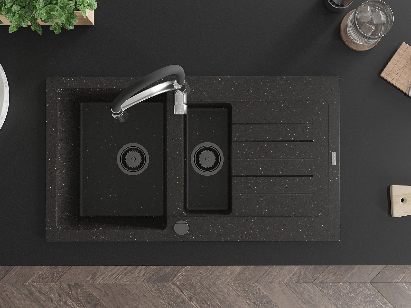 Mexen Matias 1,5 rekeszes gránit mosogató lefolyóval és Aster konyhai csapteleppel, fekete/arany metál - 6502-75-73450-07-B