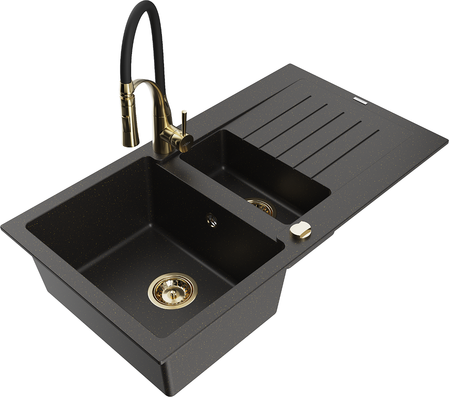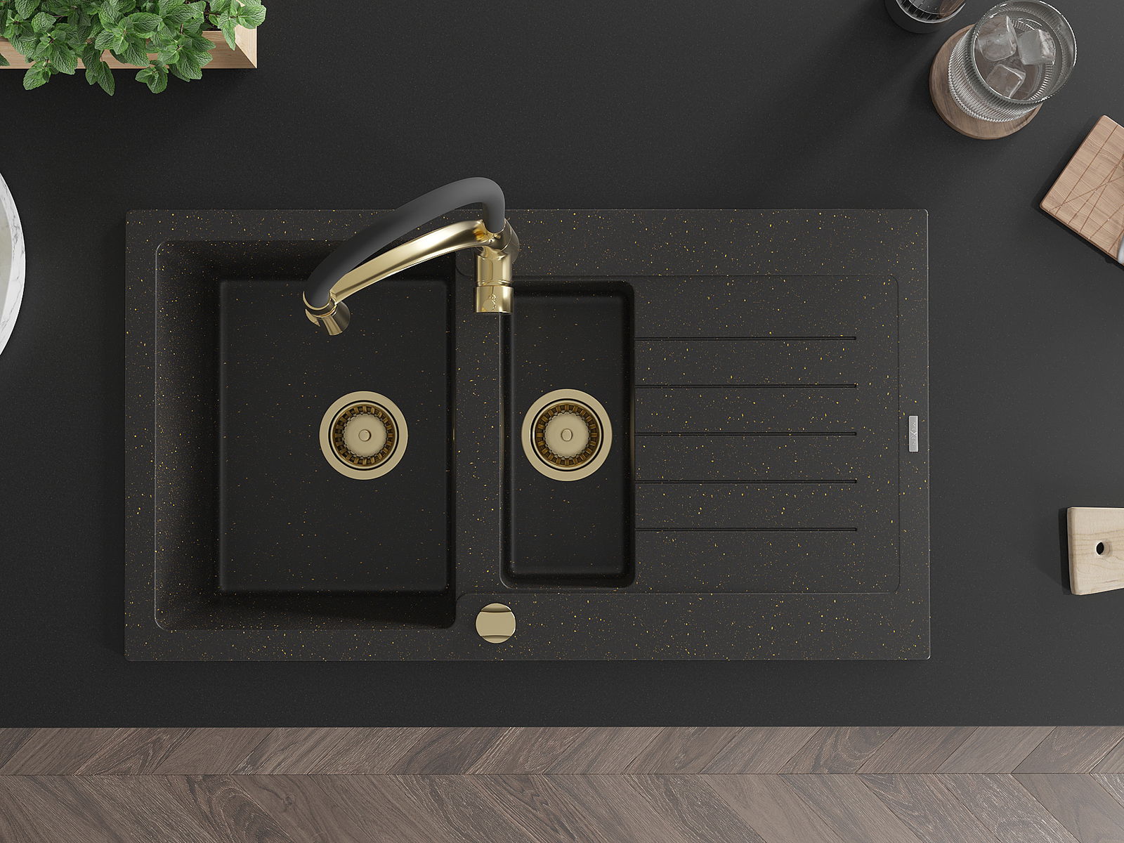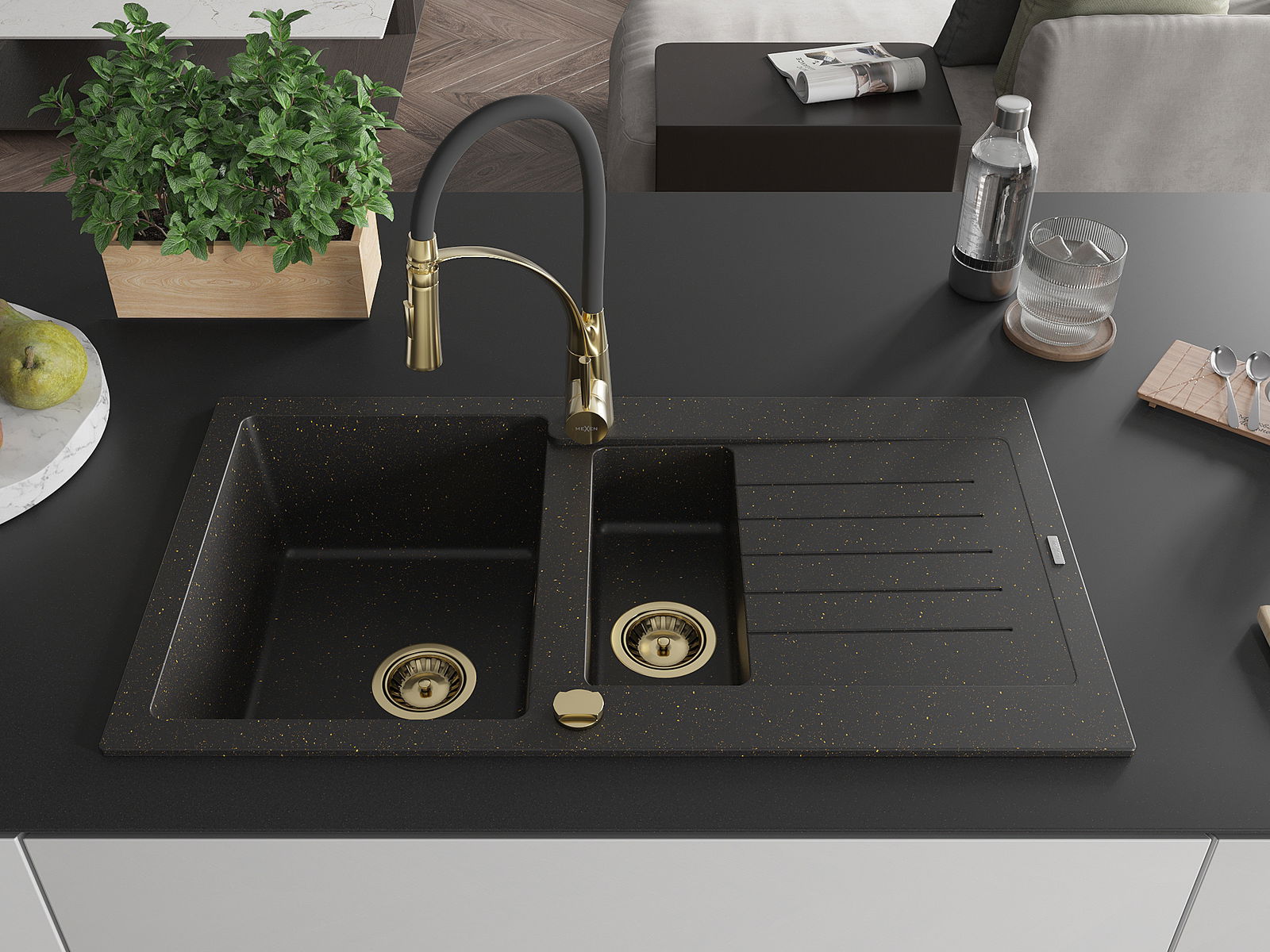 Mexen Matias gránit mosogató 1,5 medencés csepegtetővel és Aster konyhai csapteleppel, fekete/arany metál - 6502-75-73450-57-G