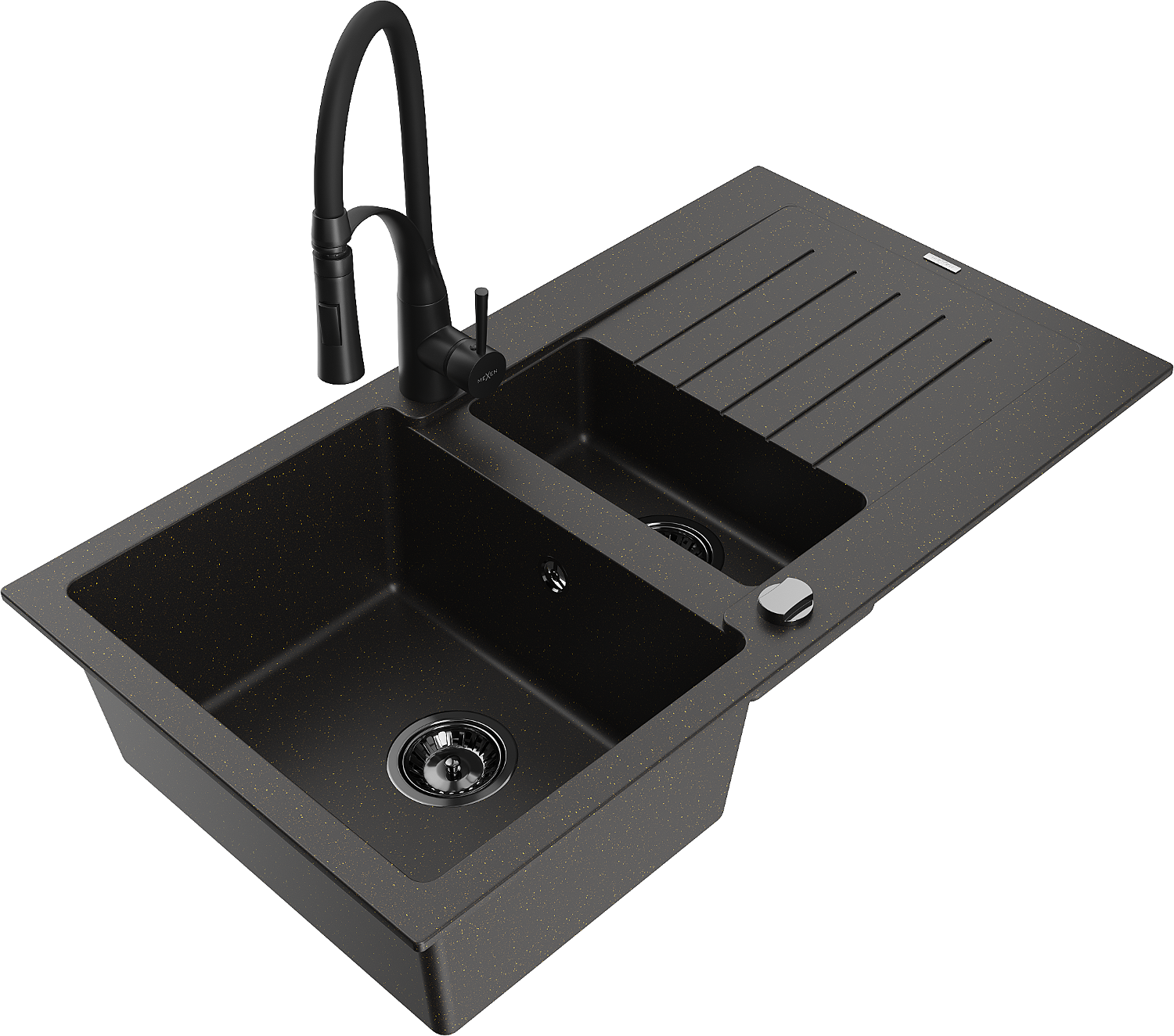Mexen Matias 1,5 kamrás gránit mosogató csepegtetővel és Aster konyhai csapteleppel, fekete/arany metál - 6502-75-73450-70-B