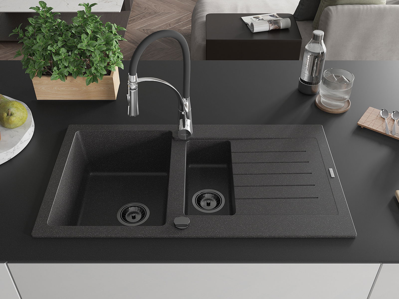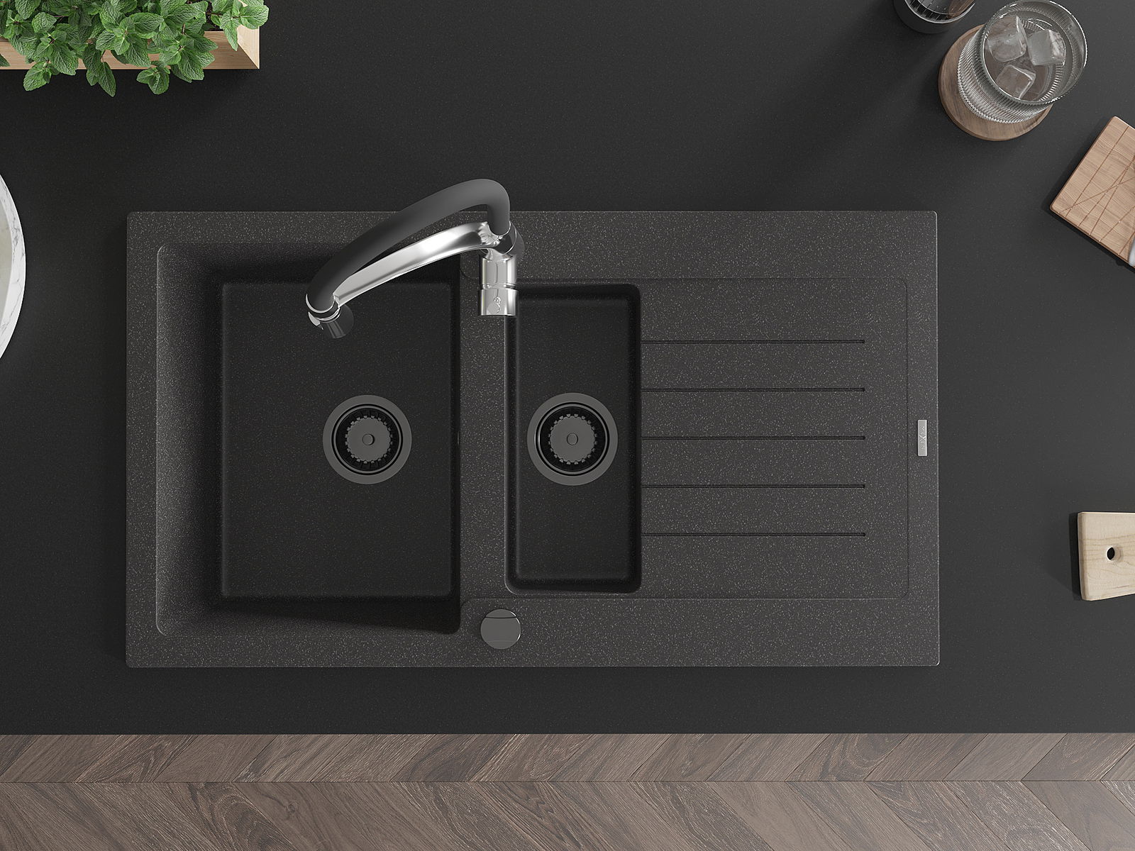 Mexen Matias 1,5-medencés gránit mosogató csepegtetővel és Aster konyhai csappal, fekete pöttyös - 6502-76-73450-07-B