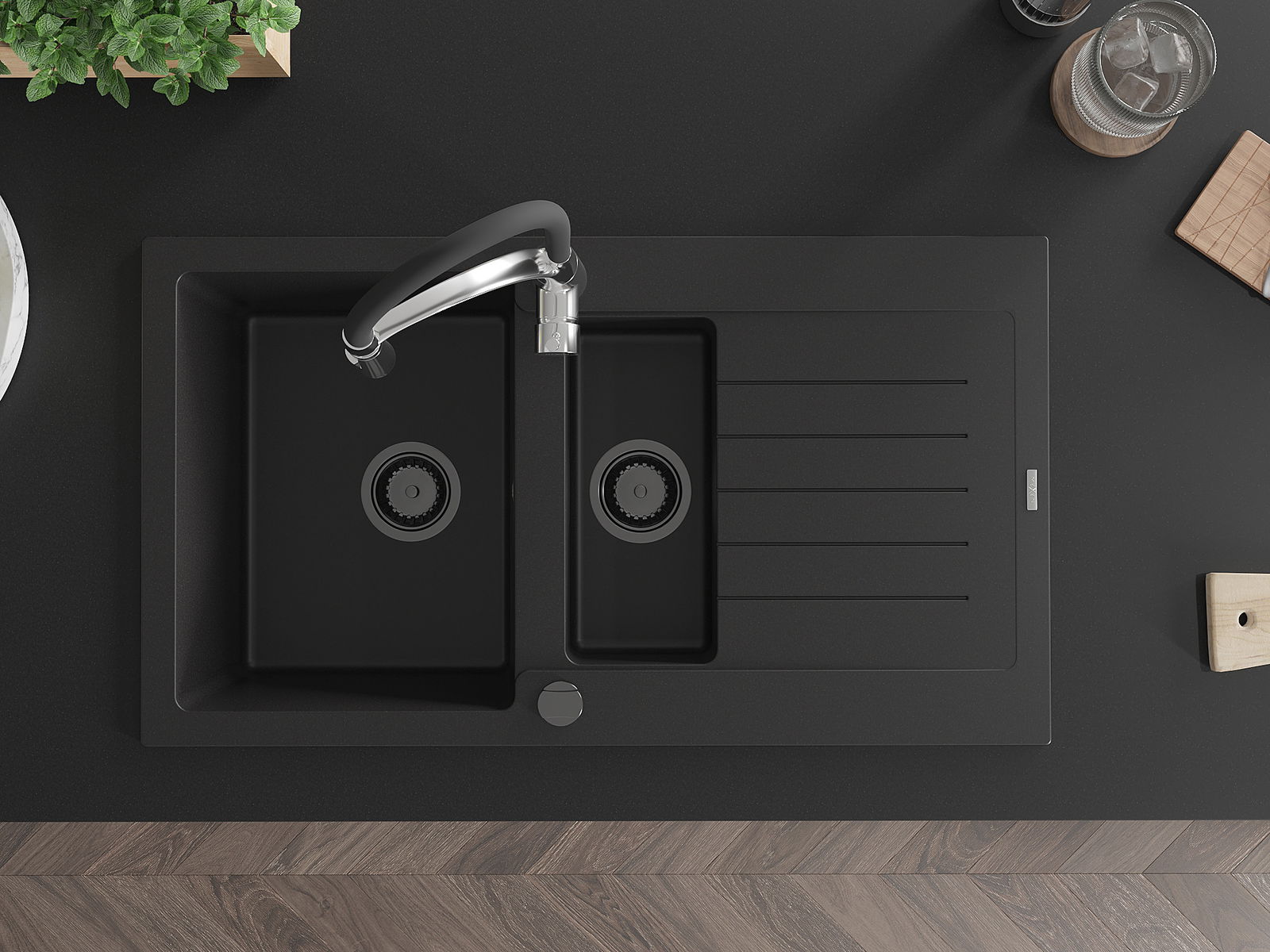 Mexen Matias 1,5 kamrás gránit mosogató csepegtetővel és Aster konyhai csapteleppel, fekete - 6502-77-73450-07-B
