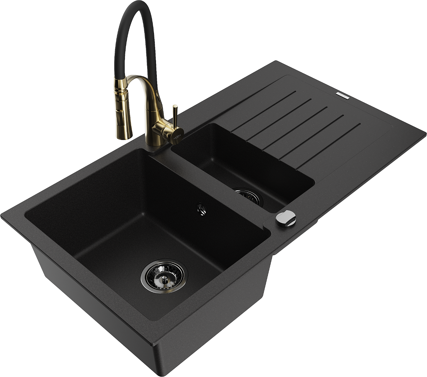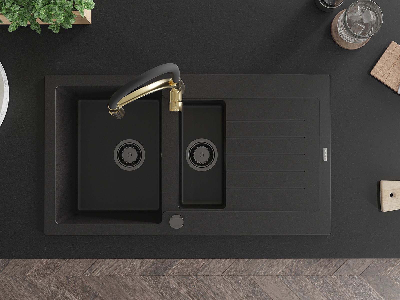 Mexen Matias 1,5 kamrás gránit mosogató csepegtetővel és Aster konyhai csapteleppel, fekete - 6502-77-73450-57-B