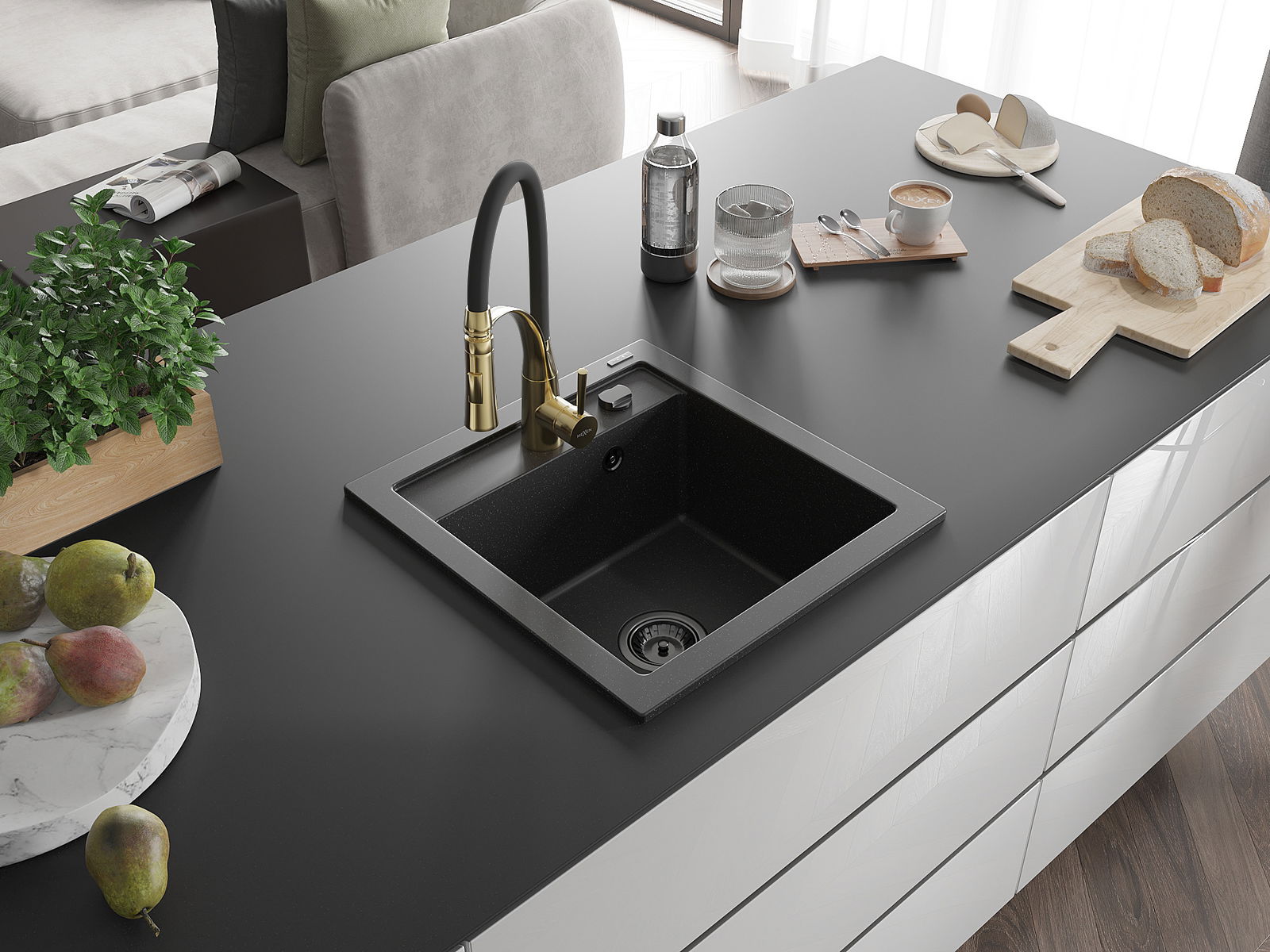 A mosogató kiváló minőségű gránitból készül. Ez egy elegáns és mindenekelőtt minden konyhához praktikus kiegészítés, stílusától függetlenül. A kiváló minőségű és a gránit tartósság biztosítja a sok éves használatát.