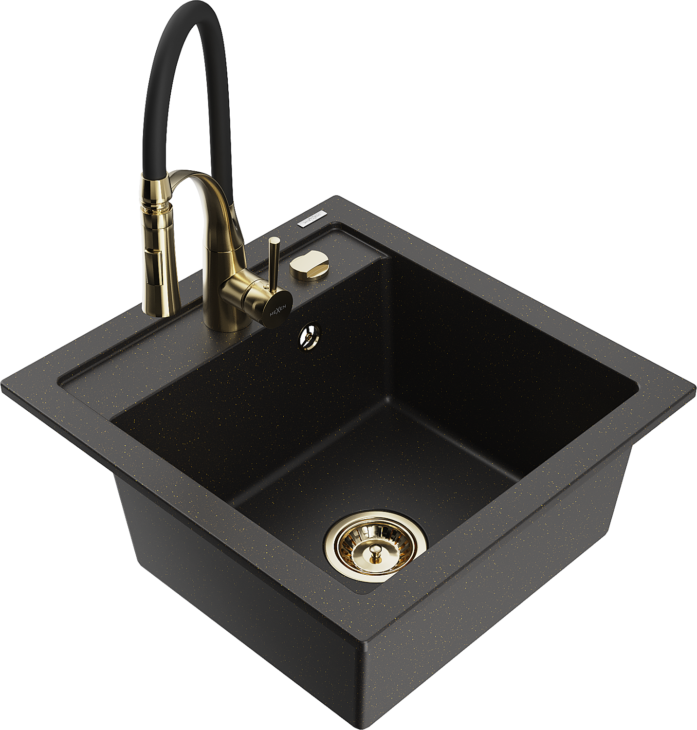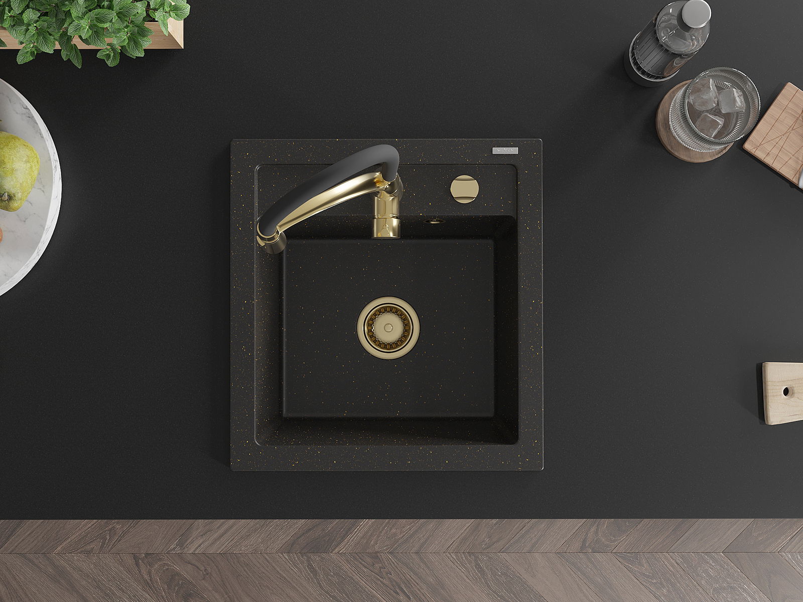 Mexen Vito 1-medencés gránit mosogató Aster konyhai csapteleppel, fekete/arany metál- 6503-75-73450-57-G