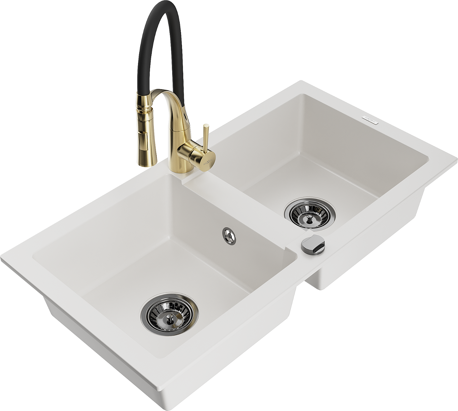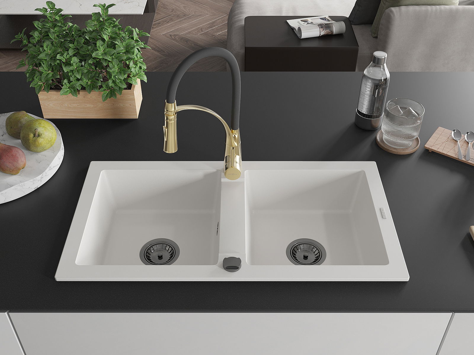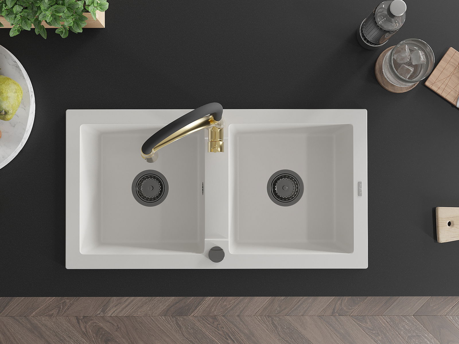 Mexen Mario 2 kamrás gránit mosogató Aster konyhai csapteleppel, fehér - 6504-20-73450-57-B