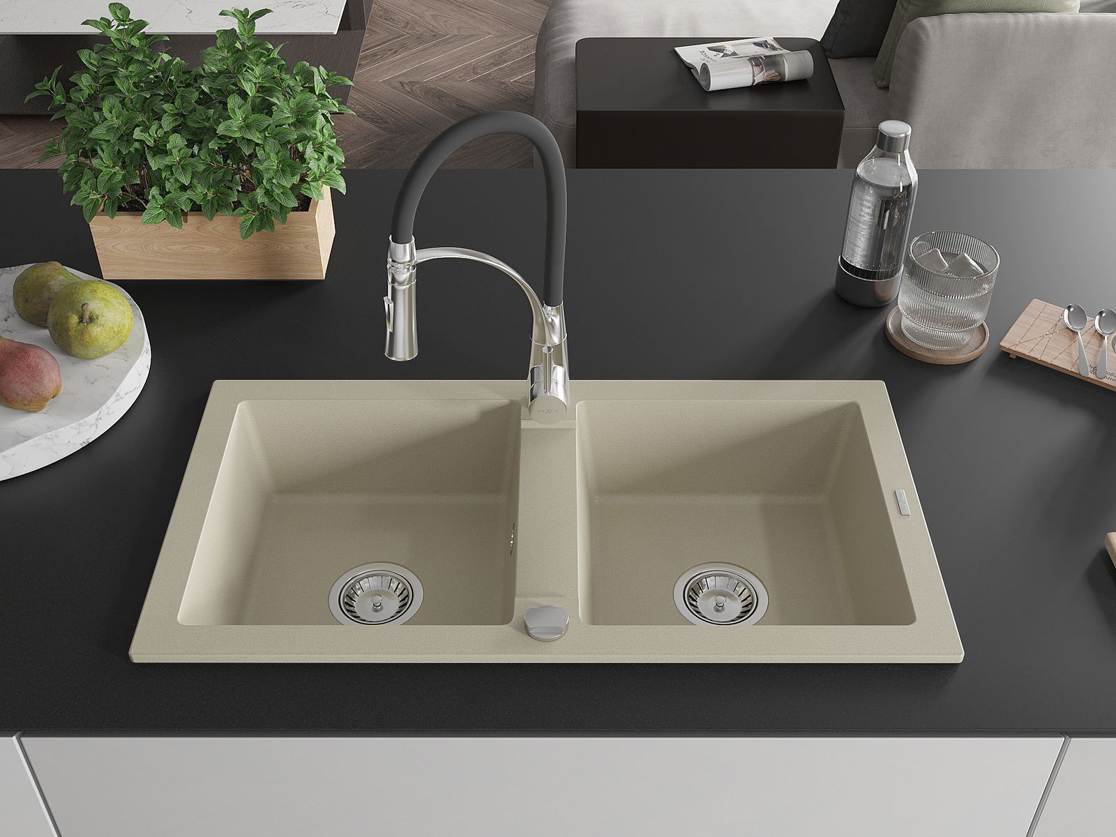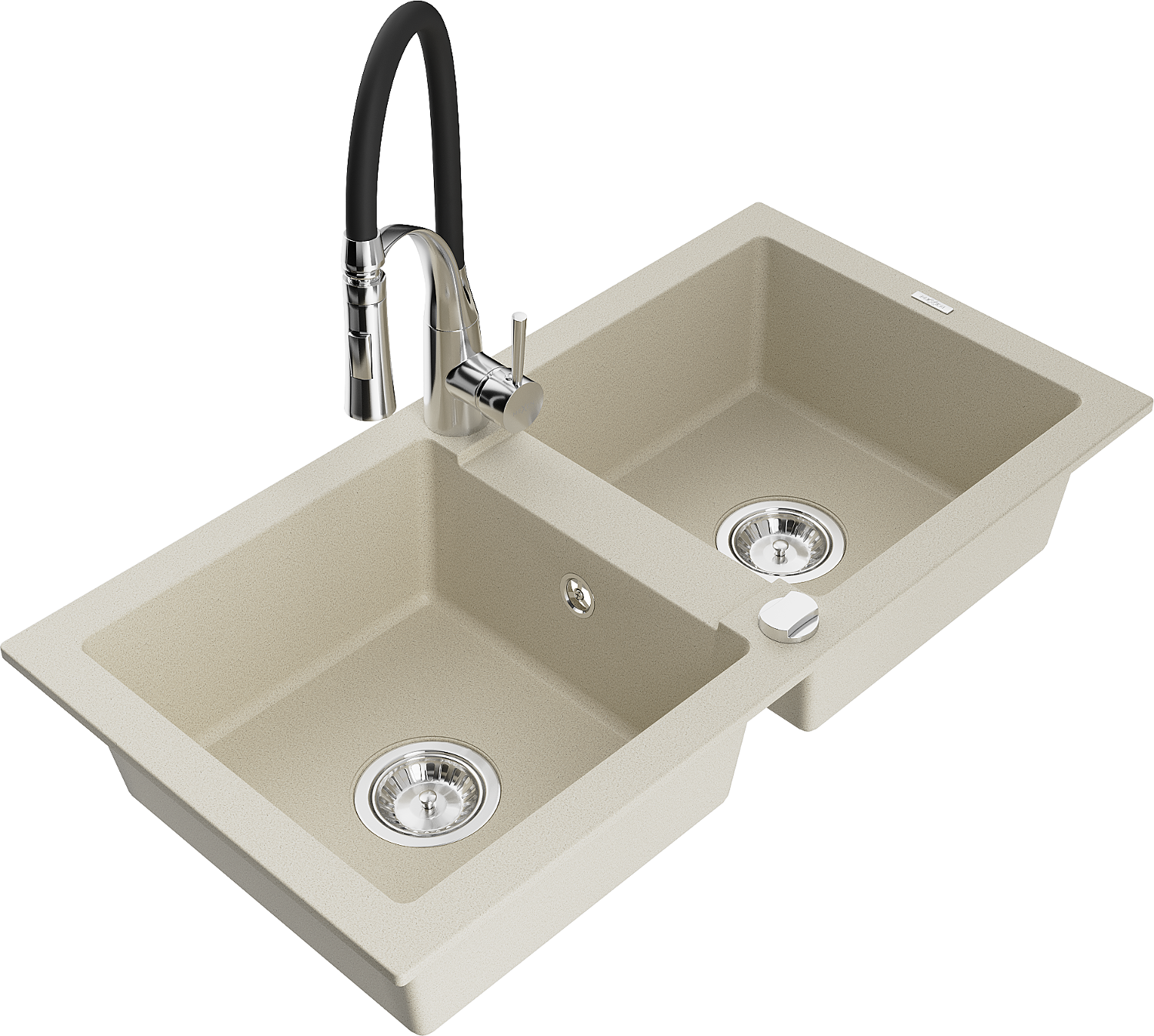 Mexen Mario gránit mosogató 2-medencés konyhai csappal Aster, bézs - 6504-69-73450-07