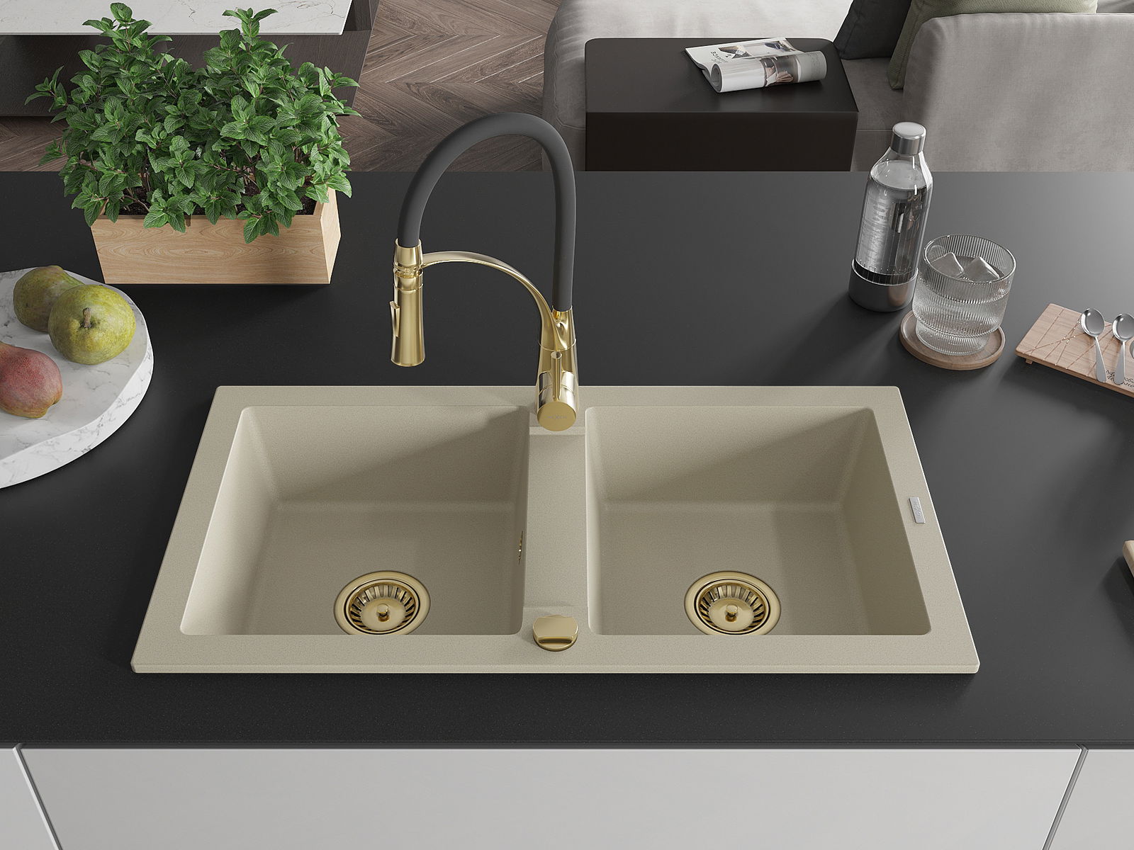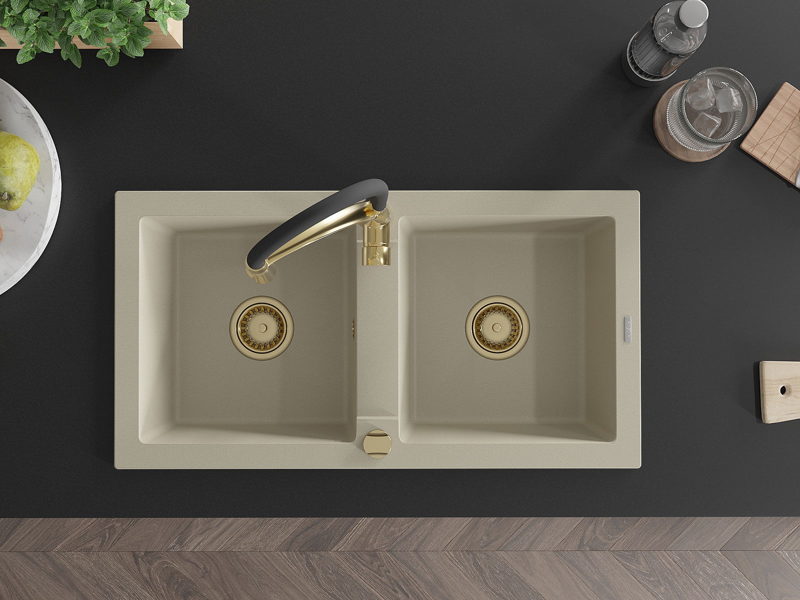Mexen Mario gránit mosogató 2-medencés konyhai csapteleppel Aster, bézs - 6504-69-73450-57-G
