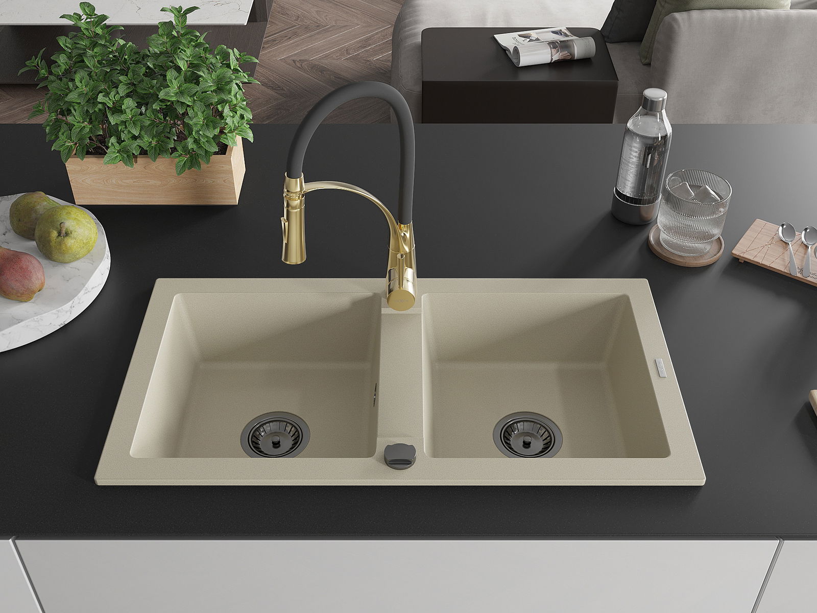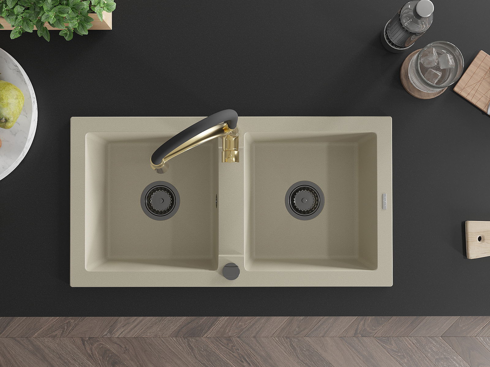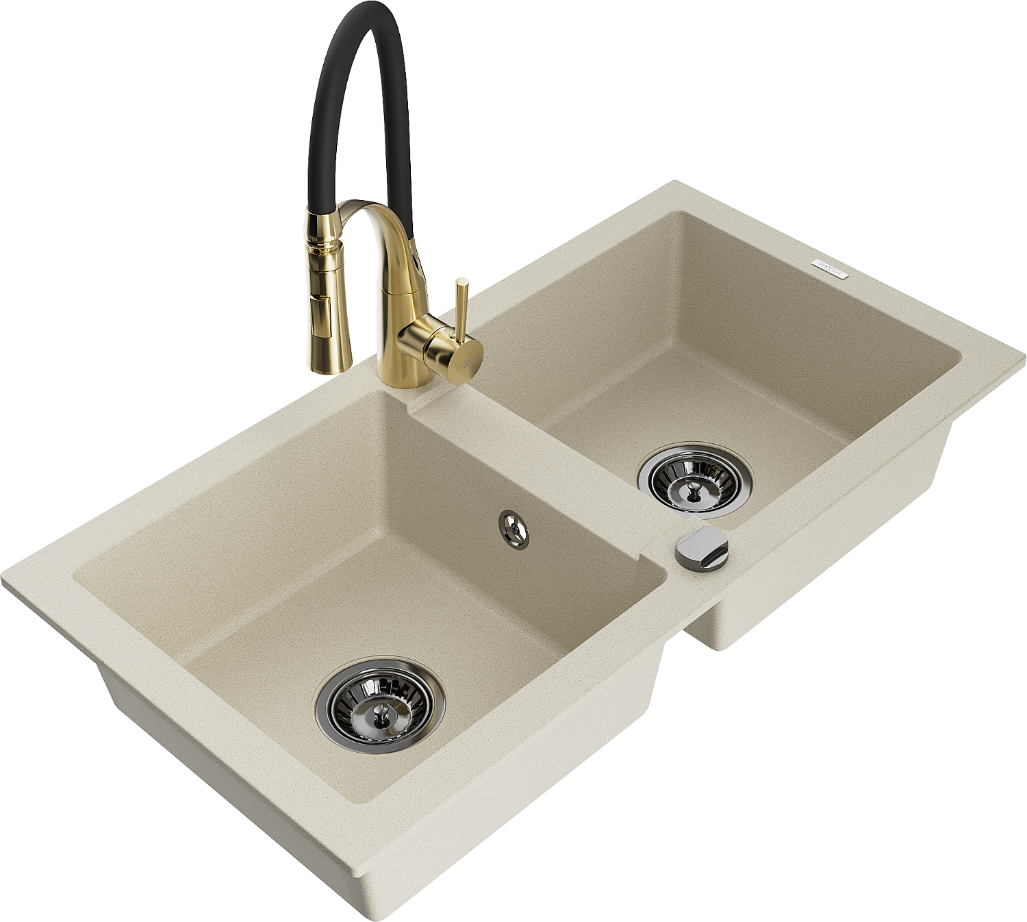 Mexen Mario 2-kamrás gránit mosogató Aster konyhai csapteleppel, bézs - 6504-69-73450-57-B