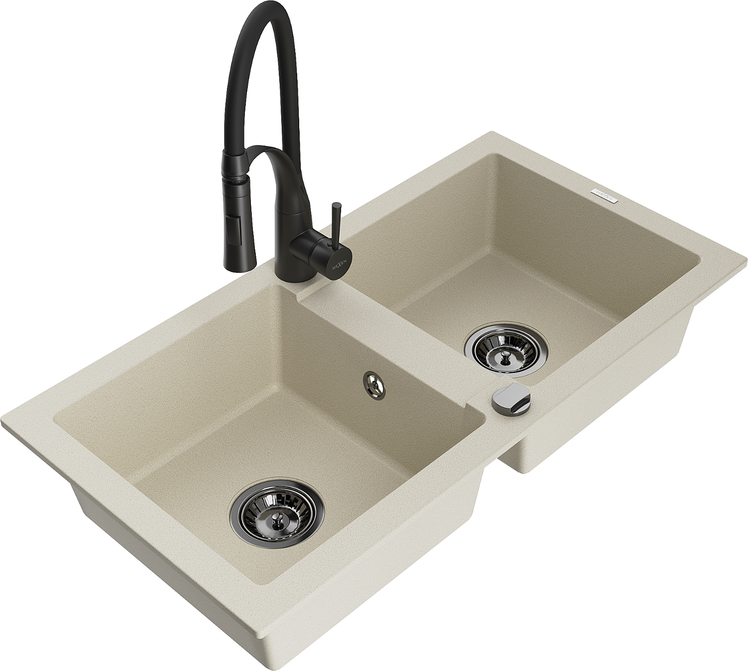 Mexen Mario gránit mosogató 2 rekeszes konyhai csappal Aster, bézs - 6504-69-73450-70-B