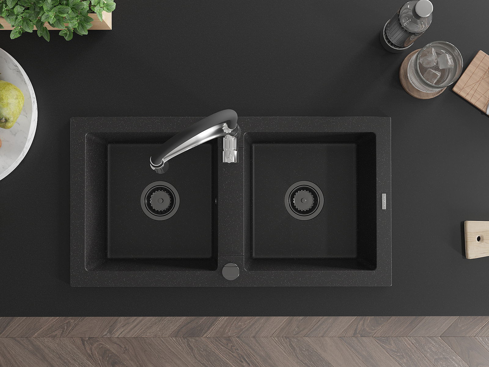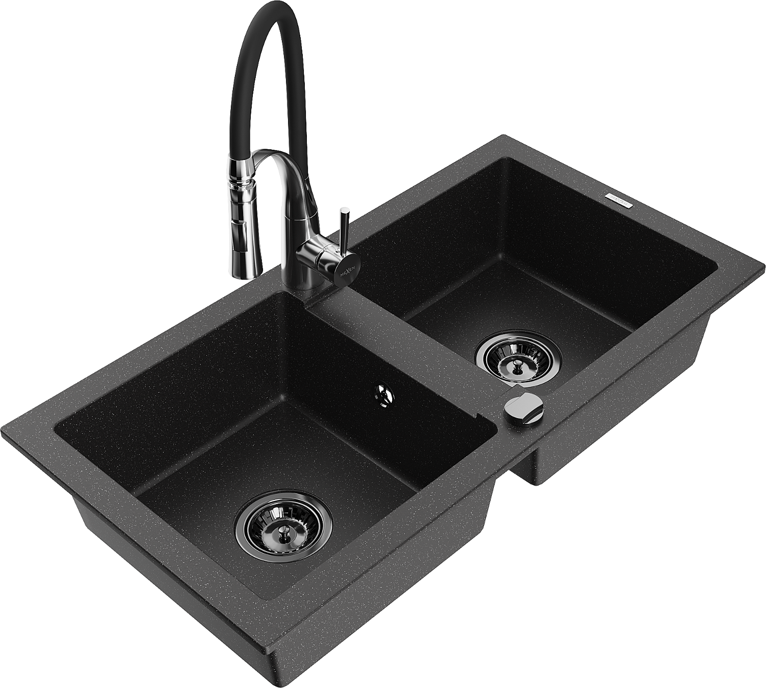 Mexen Mario 2 rekeszes gránit mosogató és Aster konyhai csaptelep, fekete/ezüst metál - 6504-73-73450-07-B
