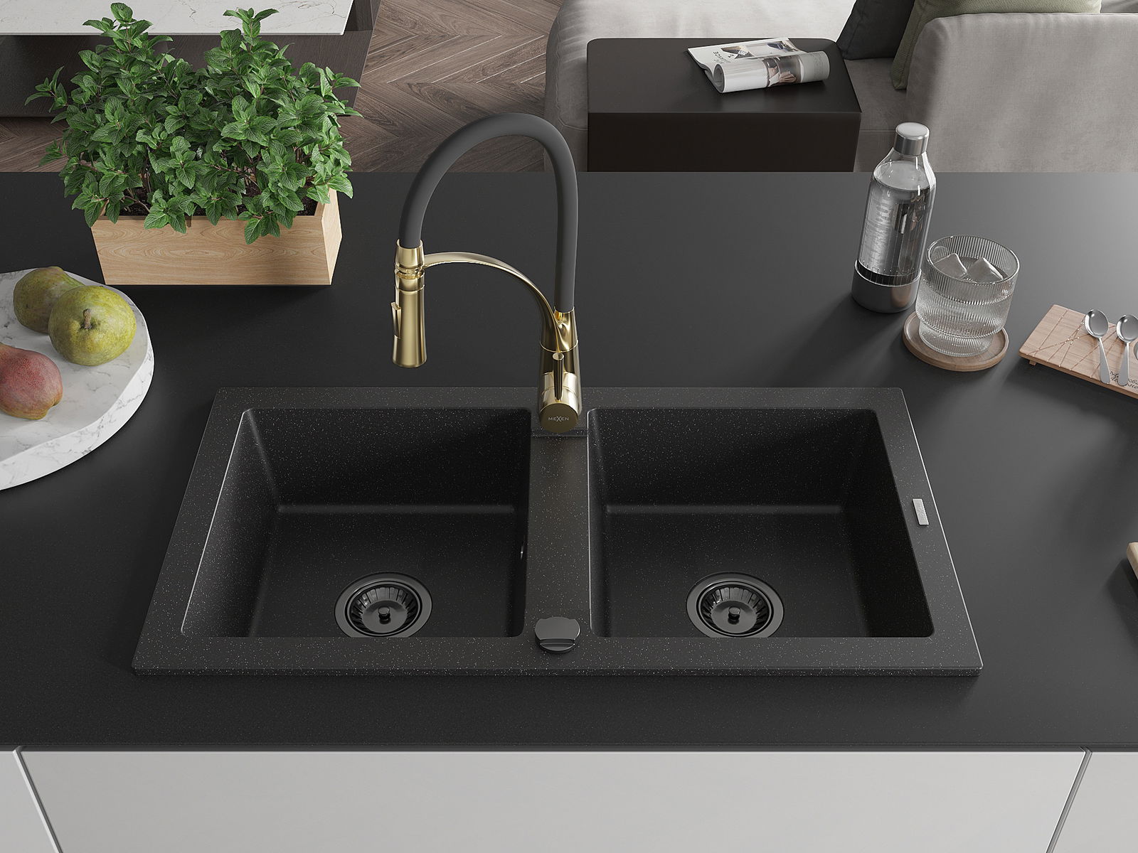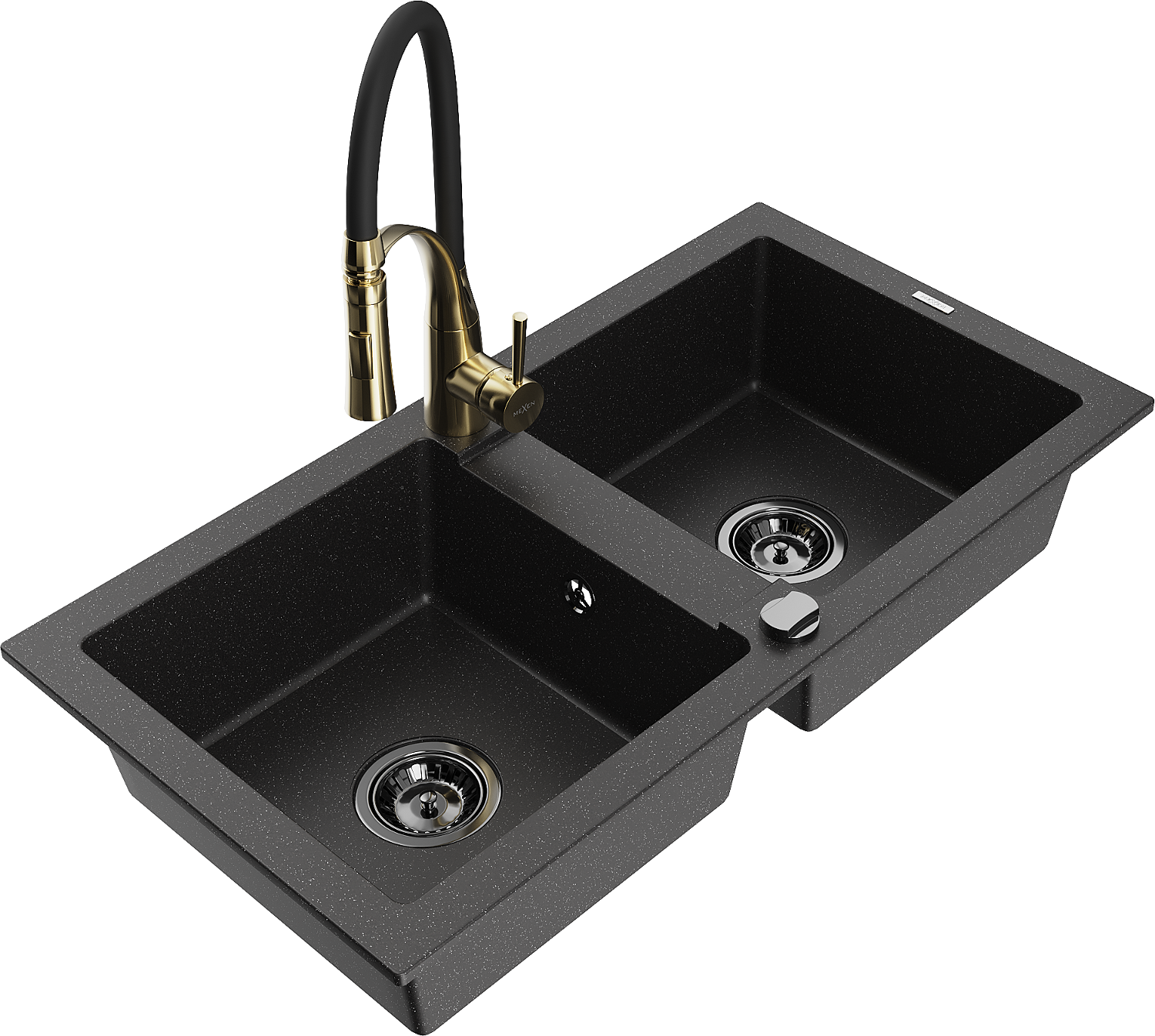 Mexen Mario gránit mosogató 2 rekeszes konyhai csapteleppel Aster, fekete/ezüst metál - 6504-73-73450-57-B