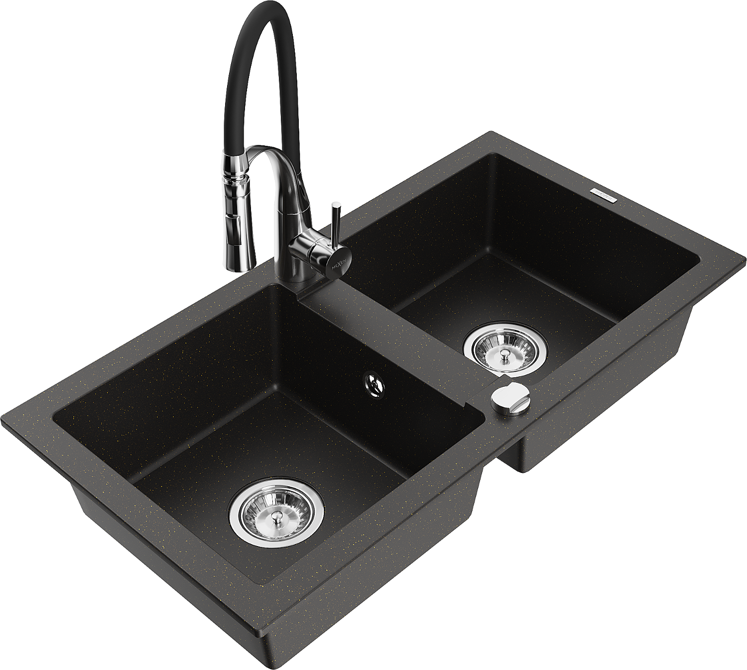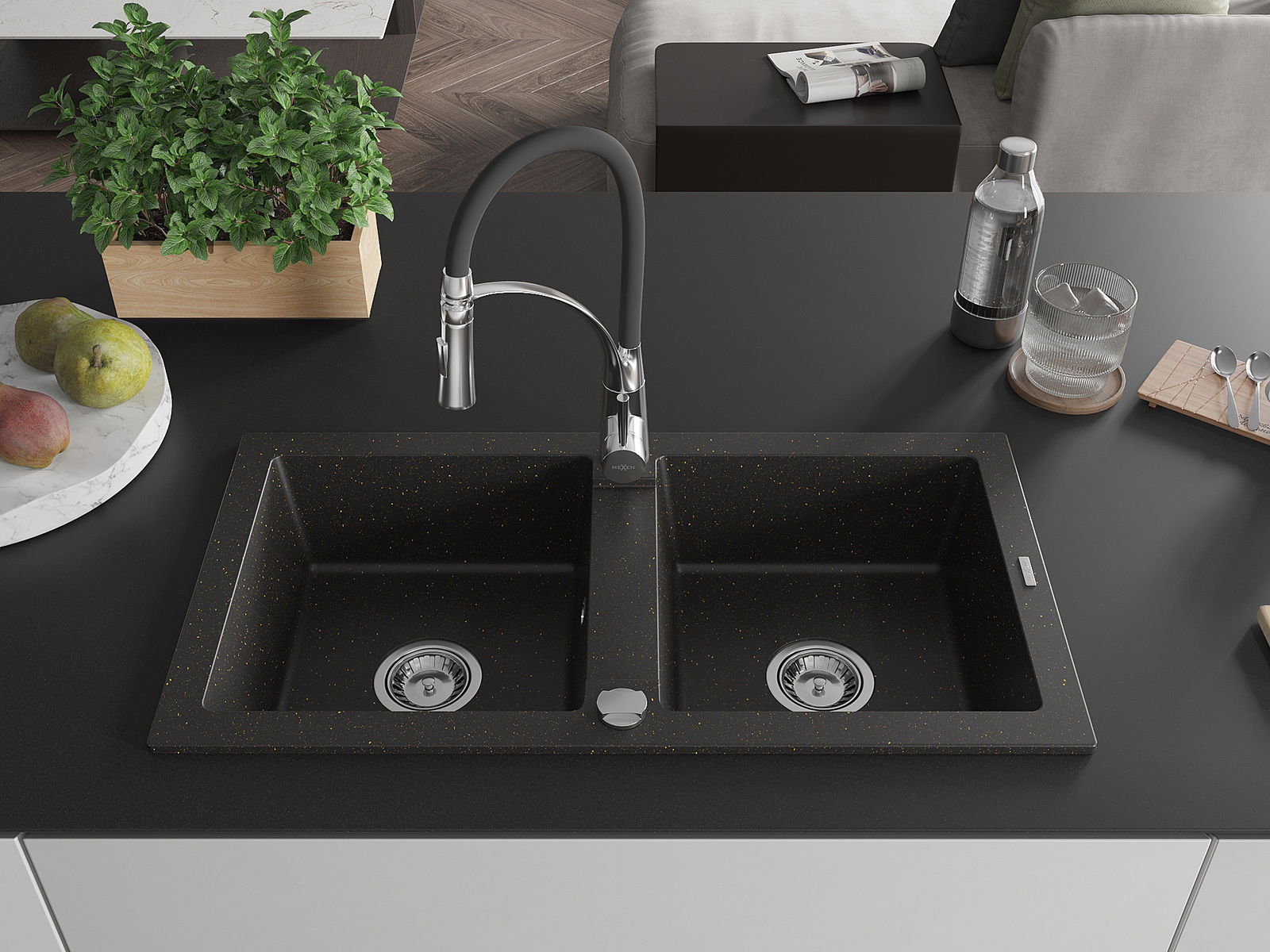 Mexen Mario gránit 2 rekeszes mosogató konyhai csapteleppel Aster, fekete/arany metál - 6504-75-73450-07