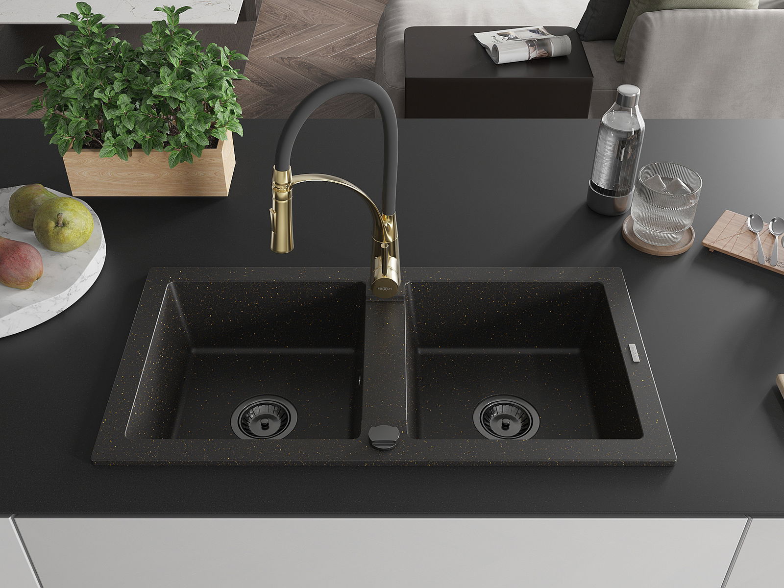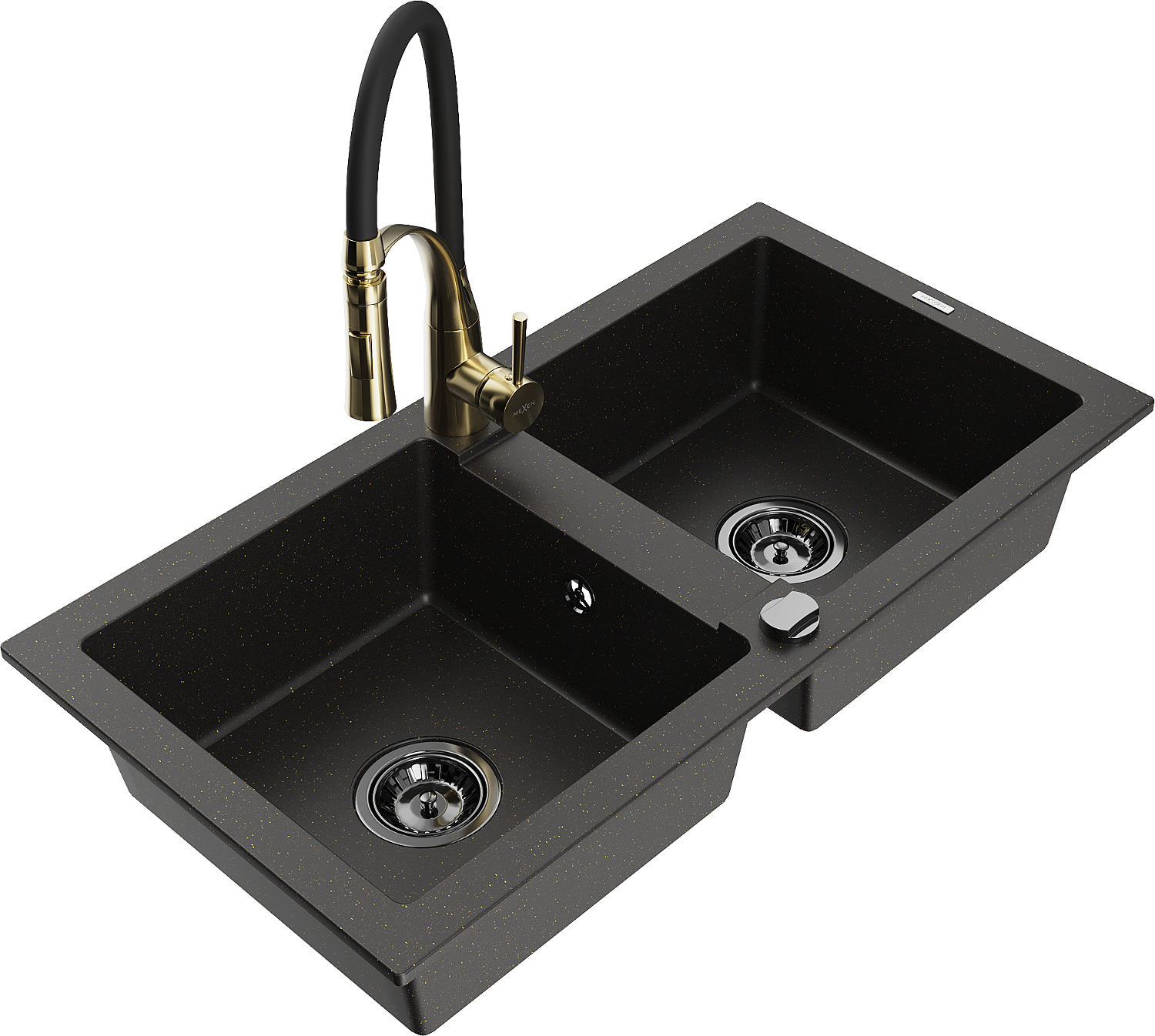 Mexen Mario 2-kamrás gránit mosogató Aster konyhai csapteleppel, fekete/arany metál - 6504-75-73450-57-B