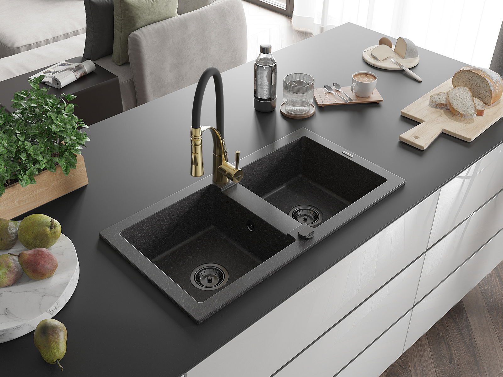 A mosogató kiváló minőségű gránitból készül. Ez egy elegáns és mindenekelőtt minden konyhához praktikus kiegészítés, stílusától függetlenül. A kiváló minőségű és a gránit tartósság biztosítja a sok éves használatát.