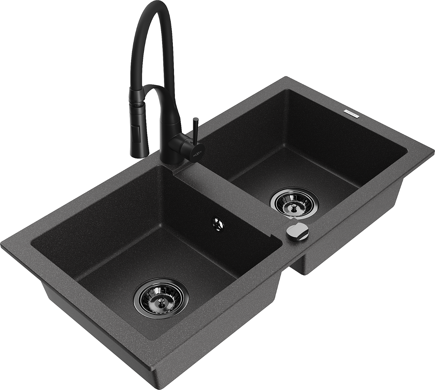 Mexen Mario 2 kamrás gránit mosogató Aster konyhai csapteleppel, fekete pöttyös - 6504-76-73450-70-B