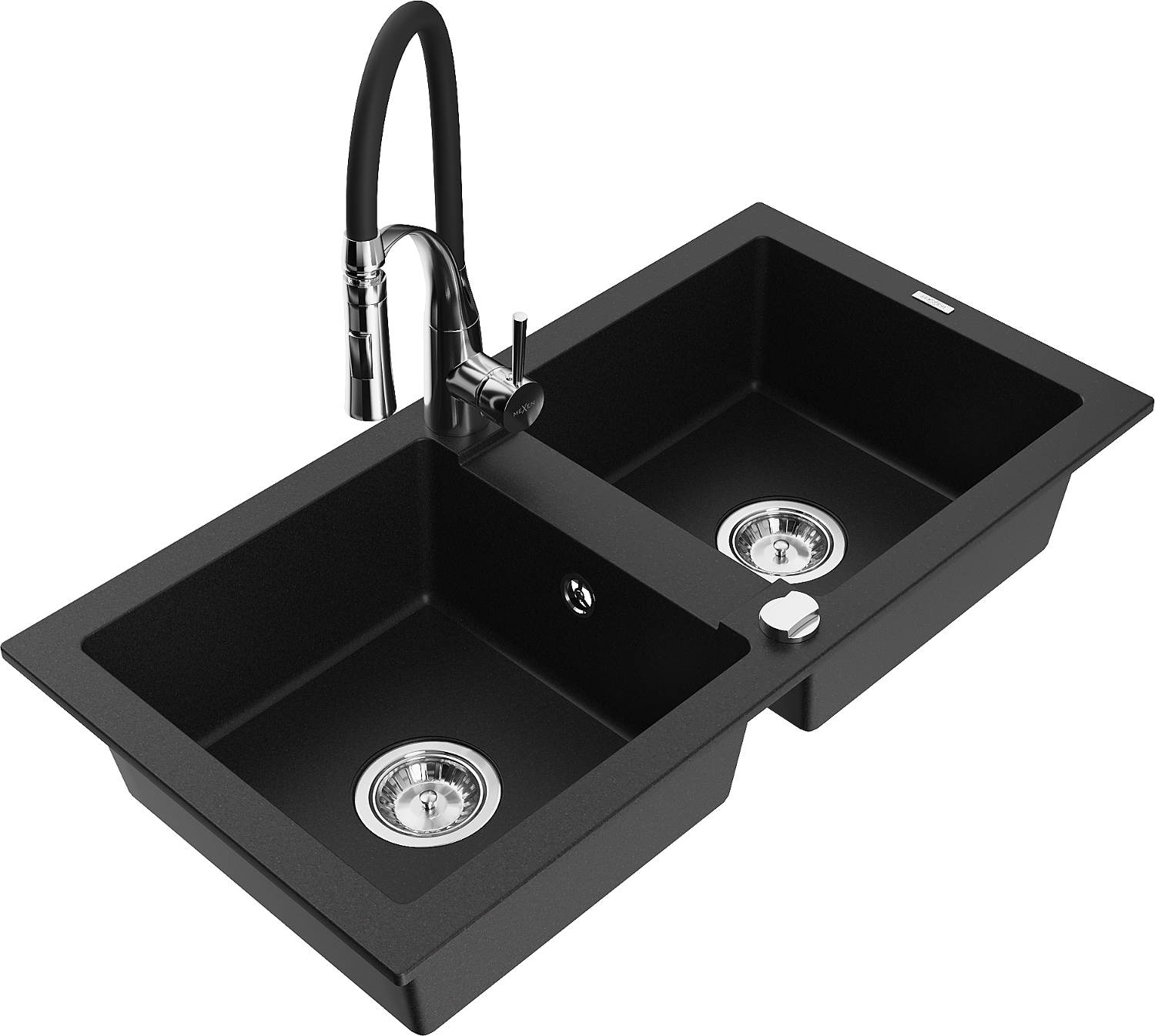 Mexen Mario gránit 2-medencés mosogató Aster konyhai csapteleppel, fekete - 6504-77-73450-07