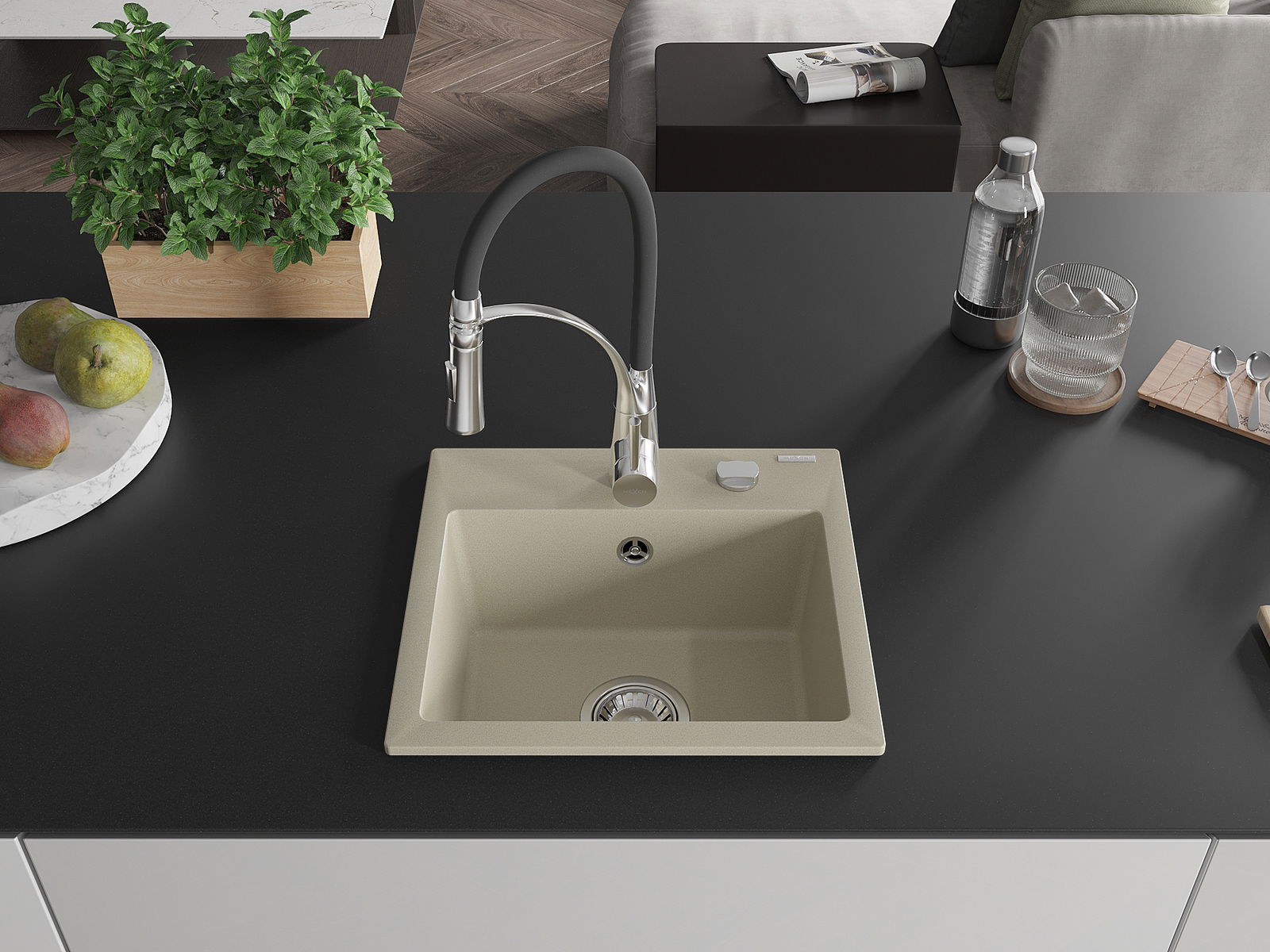 A mosogató magas minőségű gránitból készült. Elegáns, de mindenekelőtt praktikus kiegészítője minden konyhának, függetlenül annak stílusától. A gránit magas minősége és tartóssága hosszú távú használatot biztosít.