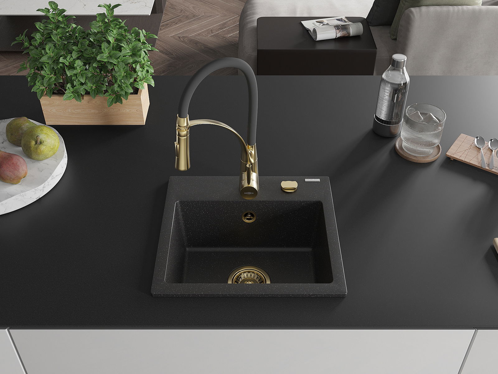 Mexen Milo egymedencés gránit mosogató Aster konyhai csapteleppel, fekete/ezüst metál - 6505-73-73450-57-G