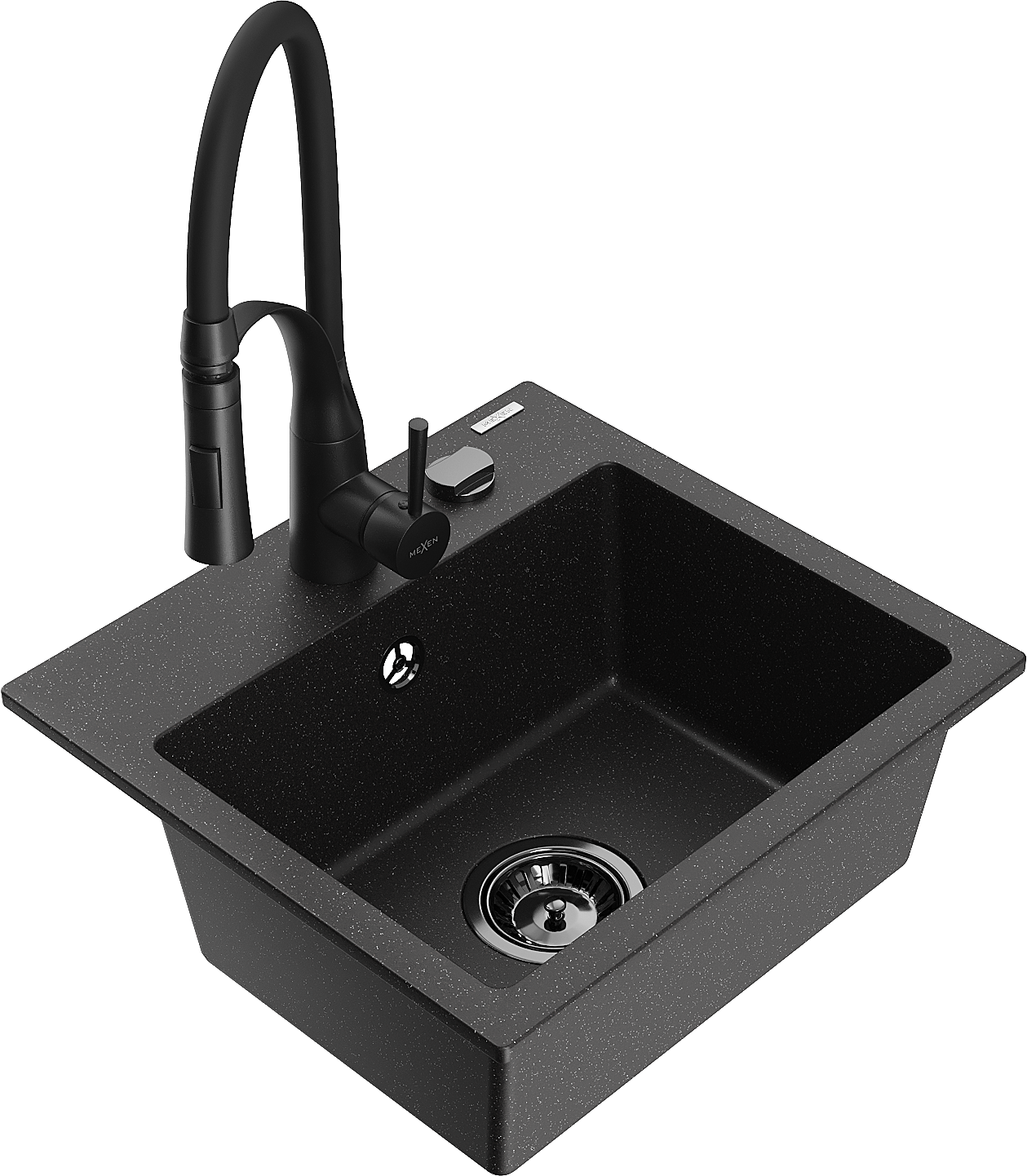 Mexen Milo 1-kamrás gránit mosogató Aster konyhai csapteleppel, fekete/ezüst metál - 6505-73-73450-70-B