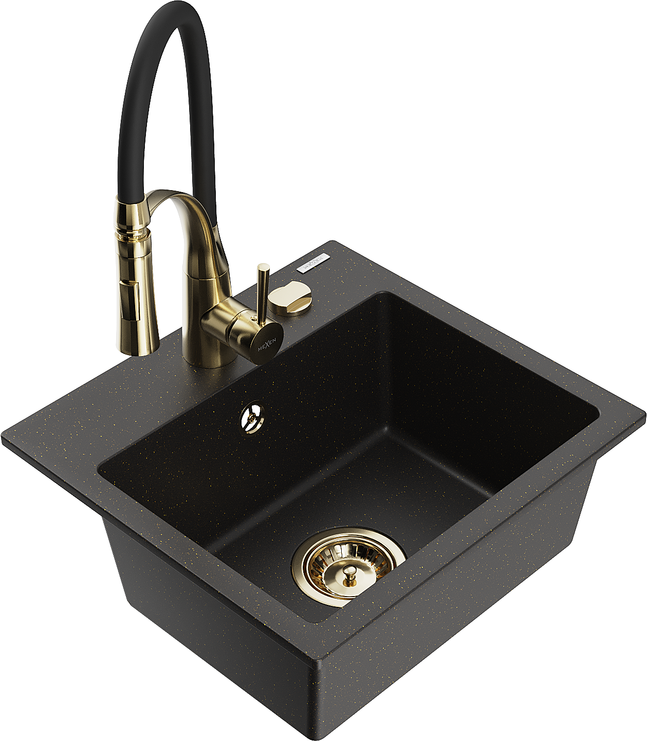 Mexen Milo 1 rekeszes gránit mosogató Aster konyhai csappal, fekete/arany metál - 6505-75-73450-57-G