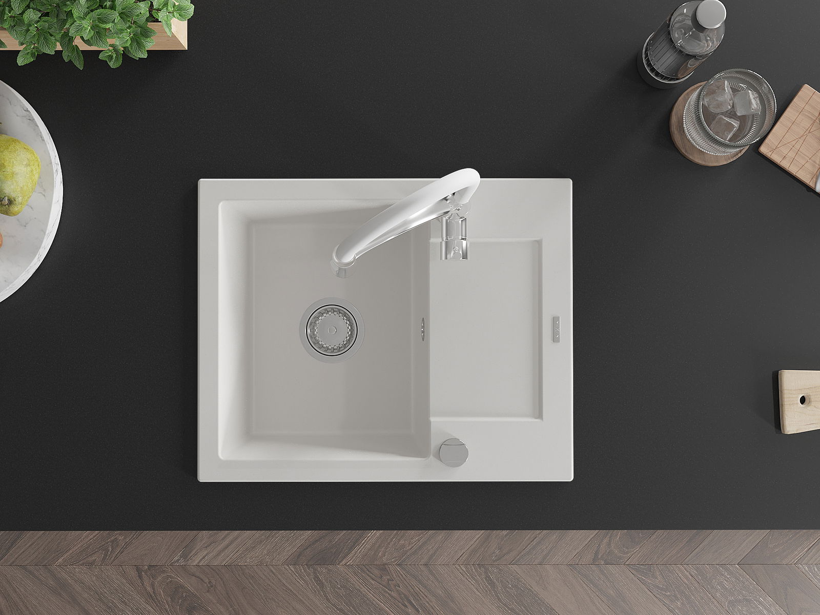 Mexen Enzo egykamrás gránit mosogató csepegtetővel és konyhai csapteleppel Aster, fehér - 6506-20-73450-02
