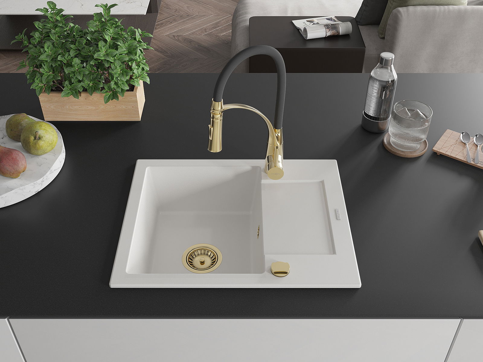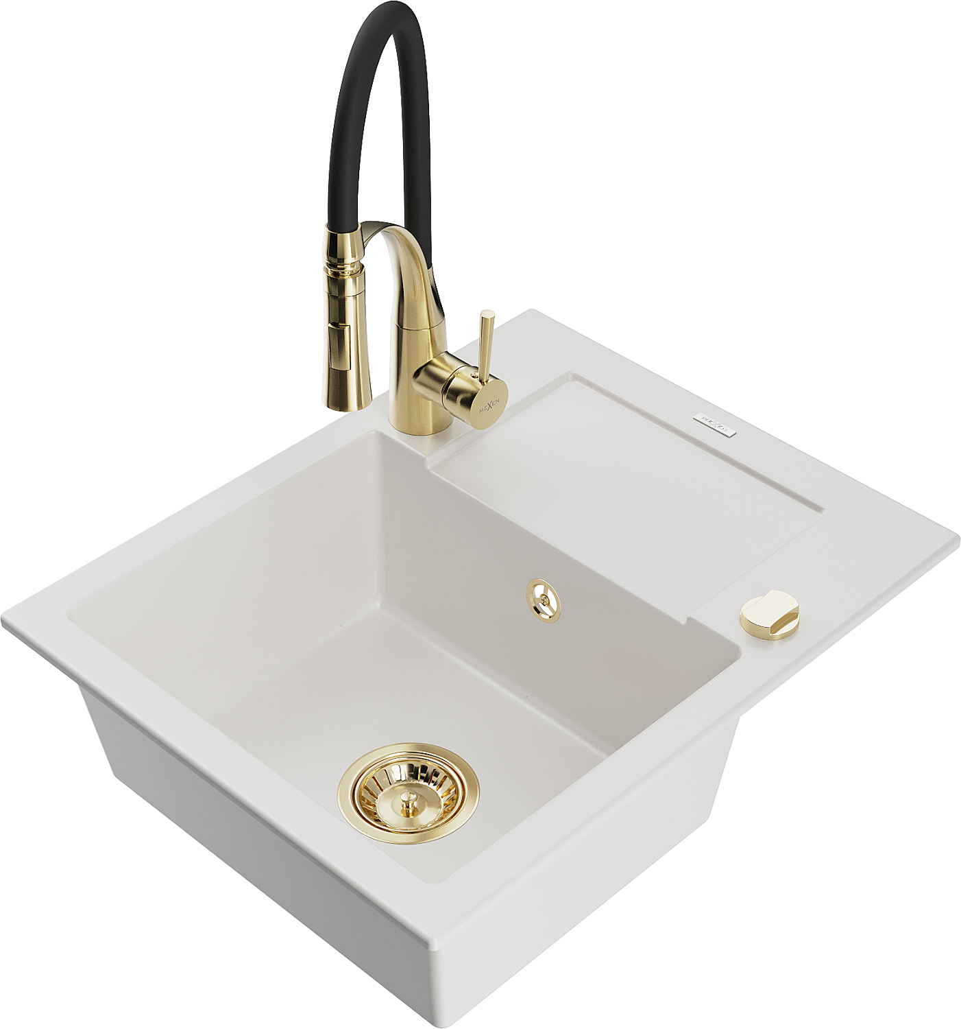 Mexen Enzo 1-medencés gránit mosogató csepegtetővel és Aster konyhai csapteleppel, fehér - 6506-20-73450-57-G